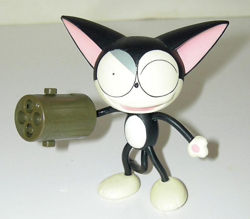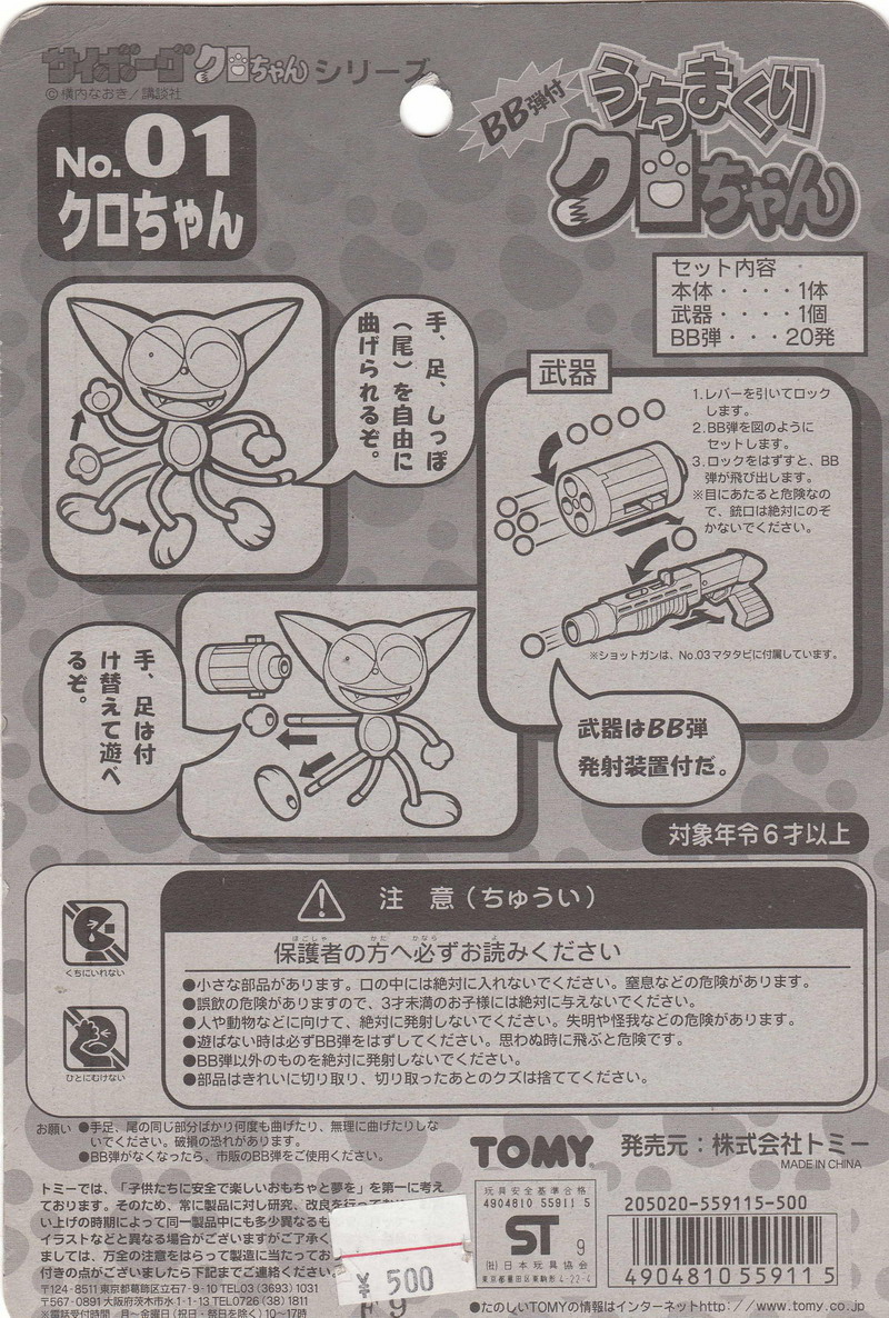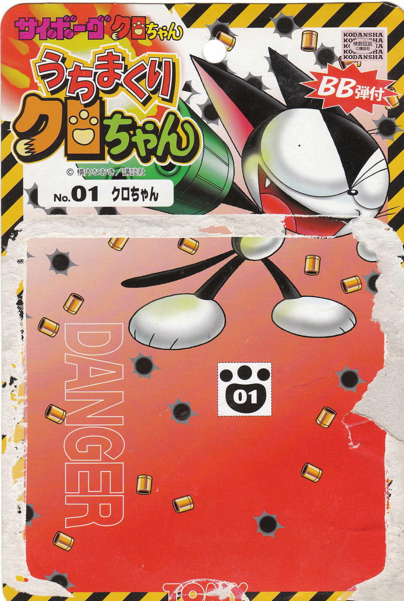 How cool is that? In addition to the insanely colorful packaging (am I buying a toy or a comic book?!), the 3" tall Cyborg Kuro-chan figure charms with its twisted cartoon sculpt. Best of all is its gatling gun arm attachment that fires REAL plastic BBs. This potentially "blinding" and "choking hazard" toy wouldn't see the light of day here in America. Cute and deadly!Cyborg Kuro-chan is a shōnen manga series created by Naoki Yokōchi, serialized in Kodansha's Comic BonBon magazine. It centers around a housecat, Kuro, who is kidnapped and modified by a mad scientist to be a part of a cyborg army to take over the world. Kuro breaks his control chip, escapes and becomes a vigilante.