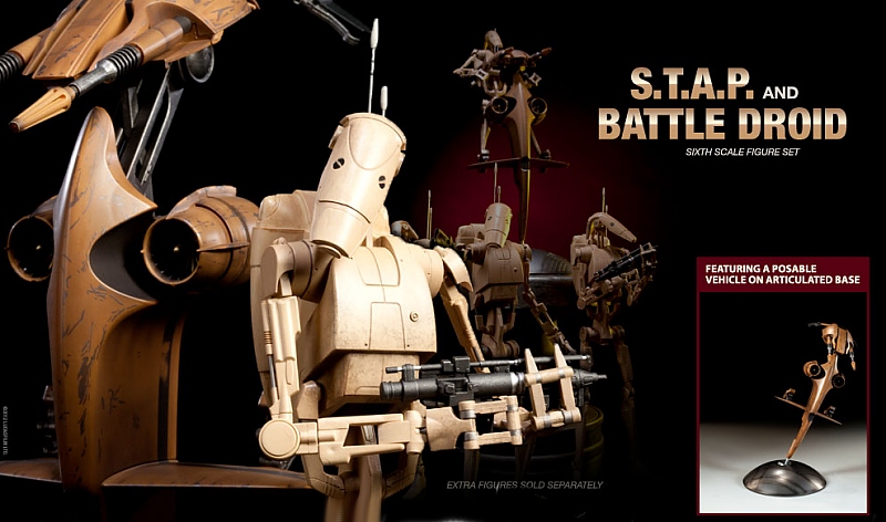 Sideshow provides a sneak peek at their next 1:6th scale Star Wars action figure, or rather figure AND vehicle set. Up for pre-order January 26th will be the S.T.A.T. and Battle Droid. Now fans just need some 1:6th scale Gungans to fight them with (not!).
