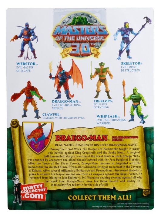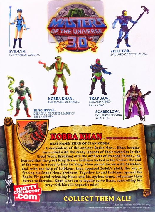 Mattel shares with MOTU fans a packaged look at two upcoming releases: Kobra Khan shipping in March 2012 as the monthly club figure, and Draego-Man arriving in April as part of the 30th sub (not the main Club Eternia Cub) with some limited day-of stock for non sub holders.