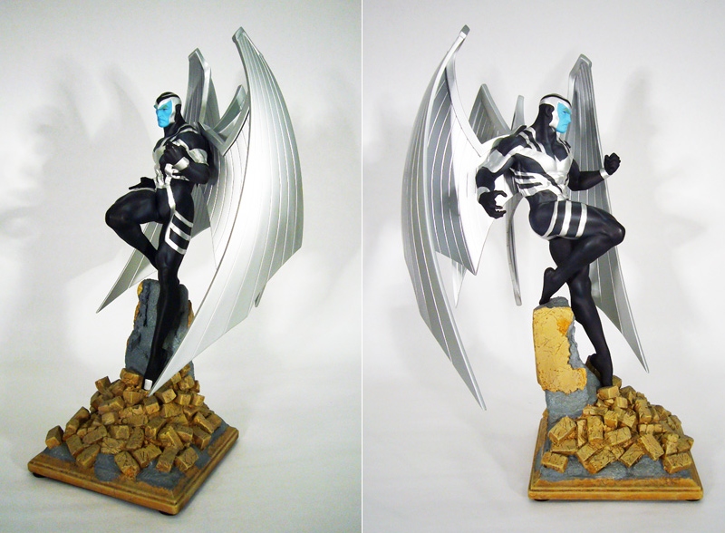 Flying characters are always tricky to capture in statue form. Often the character is either neutered by being posed about to take off or an attempt is made to disguise or hide the connection from the flyer to its base. For Archangel, Sosa chose a sort of combination that works really well for the character. Attached to his uneven base by both feet with an aggressive pose and his wings spread around him, Warren maintains a sense of movement and lightness that makes it easy to imagine him coming in for a graceful landing OR spreading his wings to launch into the air. Overall, Archangel is over 17 inches tall from base to wingtips and makes for quite a presentation. As he perches on the broken column and pile of bricks the mutant twists at the waist with a natural movement to his arms, curled up from his sides, while he stares straight ahead with a fierce scowl. Meanwhile, his multi-paneled wings unfurl behind him and to his sides, extending far above his head and below his feet.