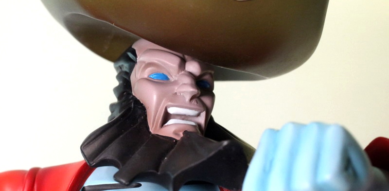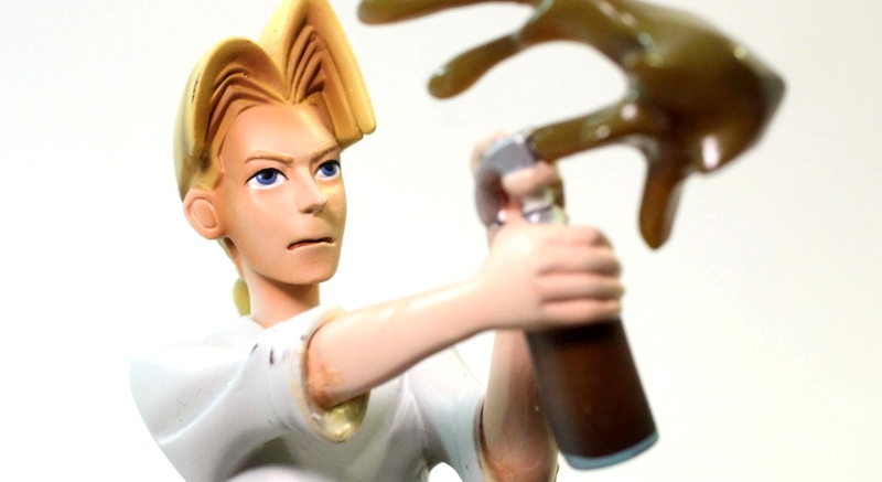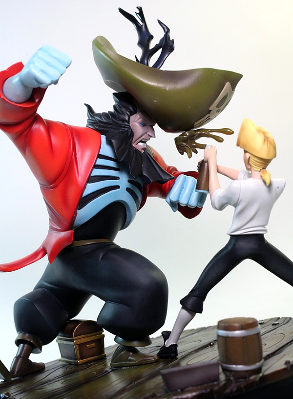 Once you have all the pieces assembled, you can admire the fun sculpt and bright paint job. The base features wood paneled floors and other details like coins, treasure chest, etc. The characters themselves have pieces sculpted on that plug directly into the base. Threepwood is positioned with a spray bottle aimed right at LeChuck’s angry face. The spray hasn’t quite hit him yet but it’s about to pretty soon!