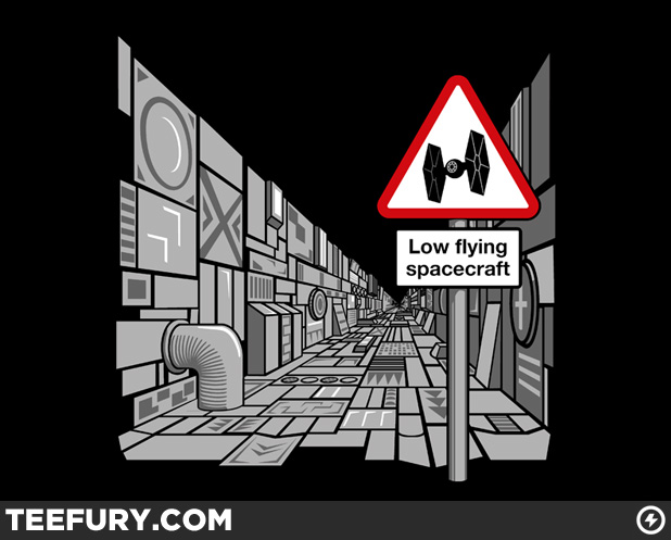 Today's original TeeFury.com t-shirt design was created by artist "doodledojo" and is called "Low Flying Spacecraft". The design adds some humor to Star Wars' climatic Death Star battle. I'm sure there were plenty more warning signs inside the Death Star as well (ie: Mouse Droid Xing and Caution: Planet Destroying Laser Beam In Action).