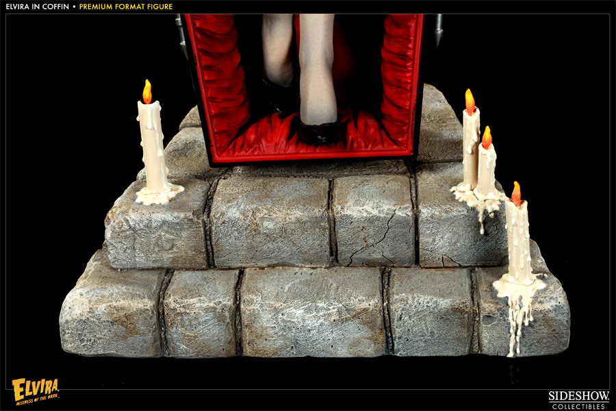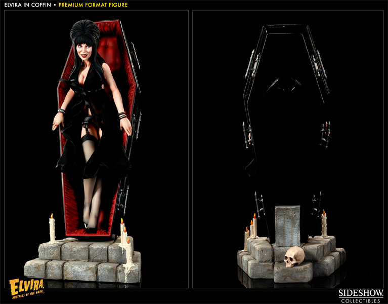 The Exclusive Elvira in Coffin Premium Format Figure will be priced at $349.99 and will include a switch-out hand holding a dagger. Additionally, a regular edition without the extra switch out item will also be priced at $349.99.