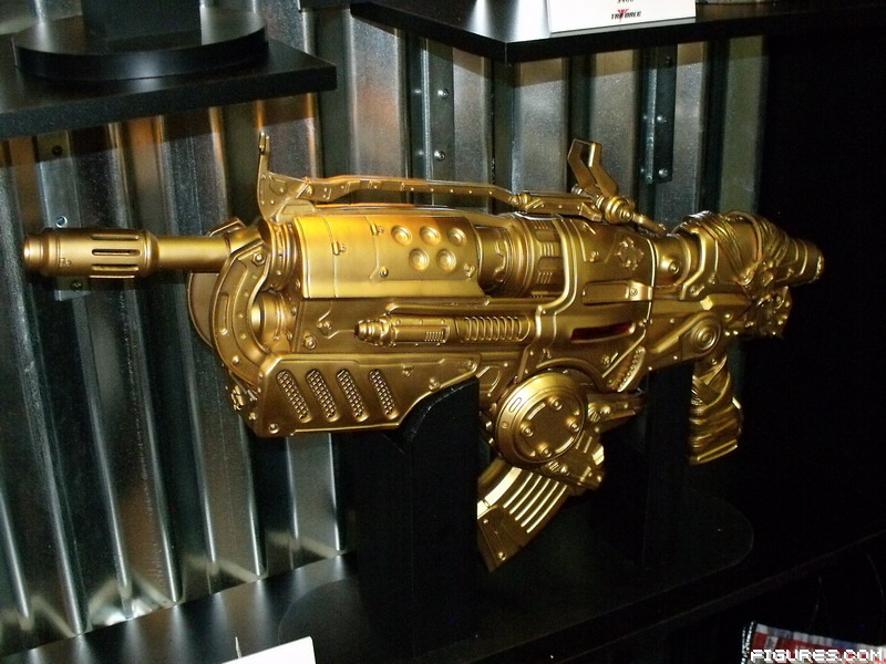 High-end movie prop replicas are nothing new, but those pulled from the world of video games are. Enter TriForce, whose replicas pulled from triple-A titles such as Gears of War 3, Mass Effect 3 and Batman: Arkham City show just how far gaming has come in terms of realistic graphics and global popularity. On display at Comic-Con was TriForce's latest offerings - a broad sampling of the games mentioned above. For Gears, the Locust Hammerburst 2 awed with two versions currently up for pre-order through projecttriforce.com: a 35 pound resin replica fully painted up as if it came off the battlefield ($212.50) and a more flashy 100 piece limited edition in gold ($225). Look for the perfect companion piece to TriForce's COG Lancer to ship first quarter 2013.