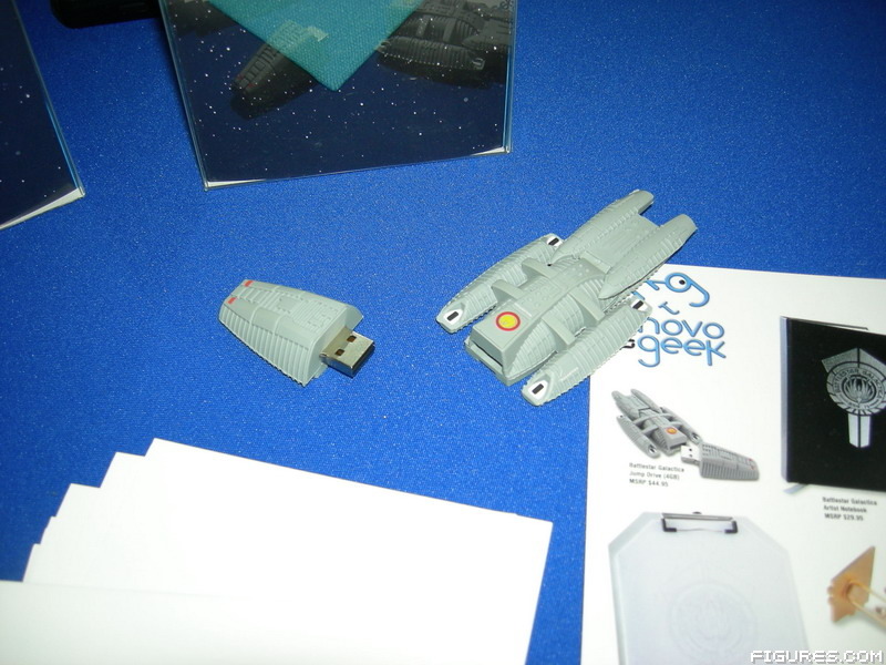 From BSG they offered cufflinks, a Triad card game, notepad and journals in the familiar “cut corners” shape from the show, uniform patches, medals, tank tops, cubit sets, BSG flad lapel pins, and more. The coolest thing was definitely the Battlestar Galactica scaled replica USB “jump” drive, a 4GB functional drive hidden inside a 4 ˝ inch spaceship!