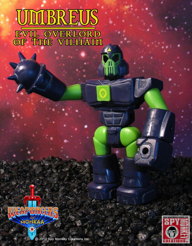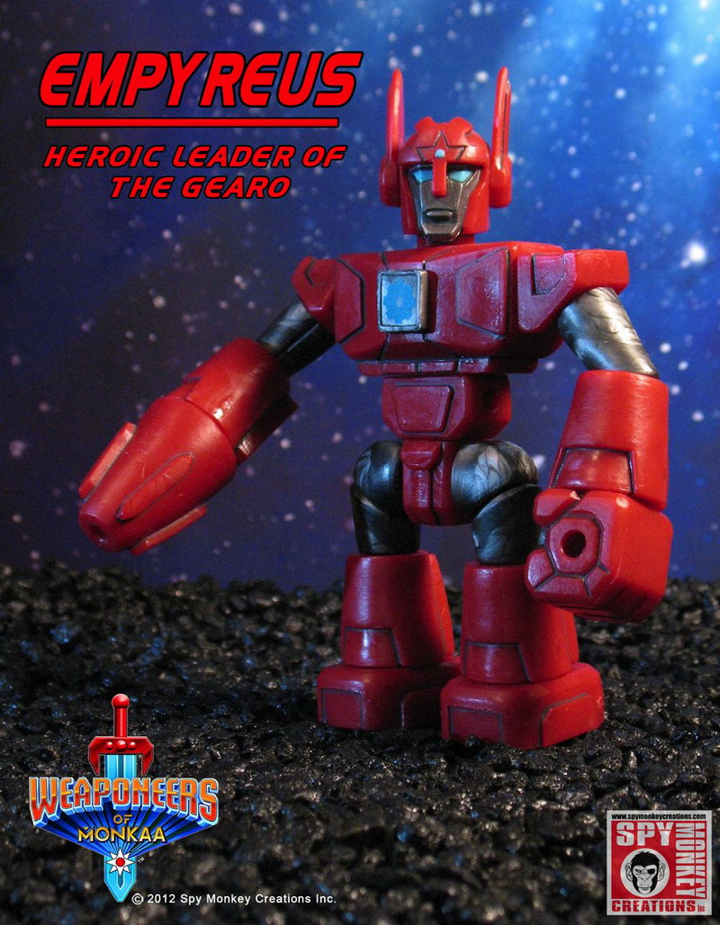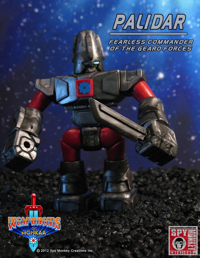 The Weaponeers of Monkaa will introduce collectors to interchangeable action figures and accessory packs utilizing the Onell Design Glyos system. Each injection molded PVC action figure and accessory set will be fully customizable and compatible will all Glyos System products including Onell, Callgrim, The Outer Space Men, and Banimon.Enter the world of the Weaponeers of Monkaa! Witness the eternal battle between the heroic Gearo and the evil Vilhain as it rages across space and time! Empyreus, Palidar and their Gearo defenders protect the cosmos from Umbreus, Brutok and the ravening Vilhain hordes! Discover the secrets of the mysterious Gohlem; will they follow the path of good or evil? Join the battle and decide the fate of The Weaponeers of Monkaa!