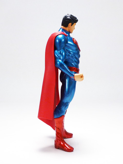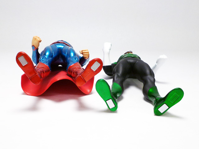 Each statue has magnets in its feet, perfect for standing on the included “Justice League” logo bases without dealing with holes and pegs; you place the figure on the base where you want him to go. The magnets are strong enough for the figures to stand securely, but don’t try to balance them on your refrigerator.
