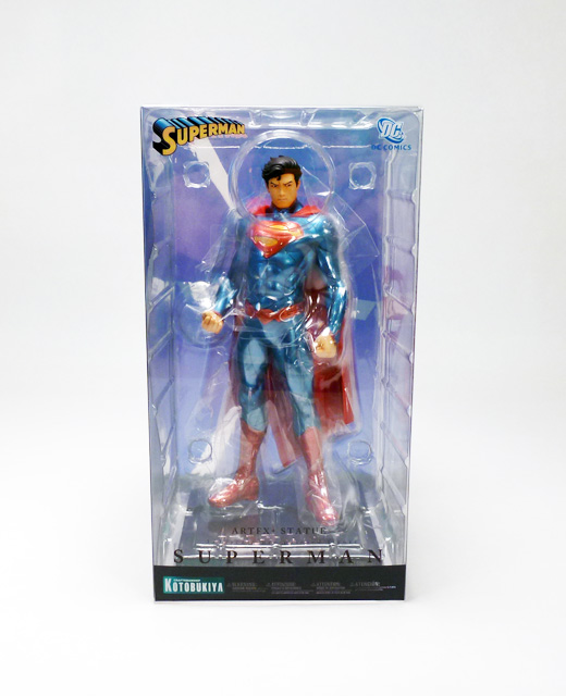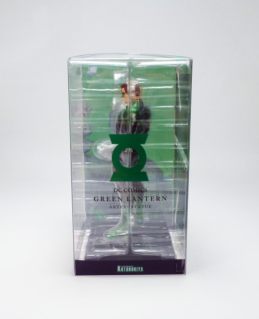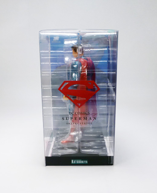 For a new, dynamic series of statues the Justice Leaguers come packaged in pretty eye-catching boxes. They’re clear so you can easily see the figure inside (though certain parts are wrapped in additional protective plastic), especially the head. In the corners of the front panel are logos, DC Comics at the top-right and the individual’s name at the top-left. At the very bottom is the character’s name and Kotobukiya branding. Each side of the box has different things going on, and it’s all cool. Turn once and you’ll get another translucent panel with a side view of the figure along with his unique emblem.