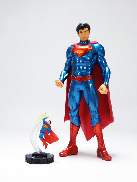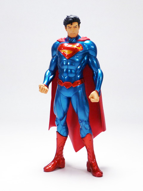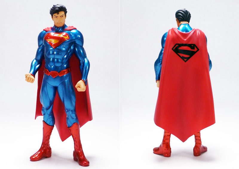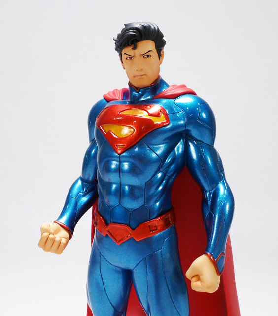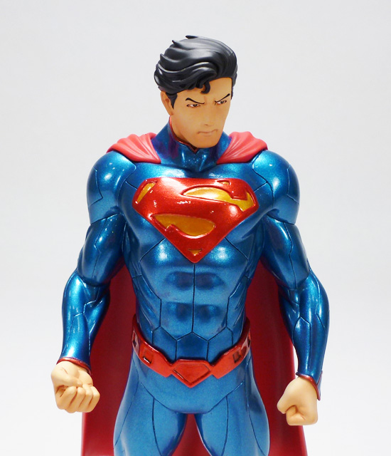 While they don’t have the most action-packed poses, Hal and Clark here have very good sculpts full of subtle detail. For the New 52 Jim Lee redesigned the classic characters’ costumes, keeping much of the overall look the same while tweaking here and adding elements there. Superman lost his red briefs in favor of a high-tech belt, and similar thematic updates were made to his outfit with armored boots, a pattern of intricate lines across the suit, a raised chest shield, etc. All of these made it onto the ARTFX+ statue, making this one of the most accurate New 52 Superman representations yet. Superman has a powerful physique apparent in his relaxed stance, but is not overly muscled. The aforementioned lines in his costume are deep and well defined, and the new shield, boots, and belt look great. The Kryptonian’s cape is understated but fitting on this presentation, and the character’s face sculpt captures Clark’s intense stare and set jaw.