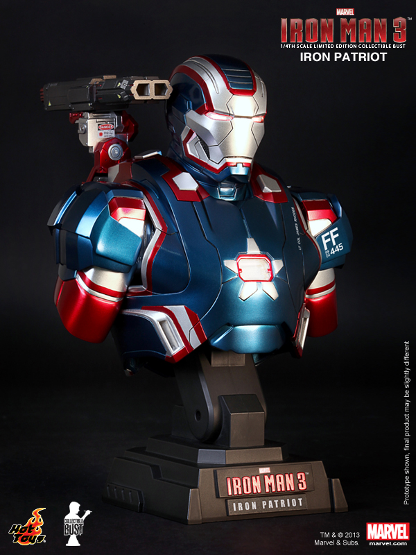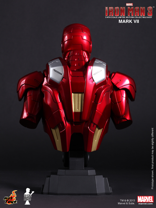 Hot Toys presents two new additions to their Iron Man 3 Collectible Bust collection. Joining Iron Man Mark XLII and War Machine (see our story HERE) comes Iron Patriot and Iron Man Mark VII. Approximately 1/4 scale, each bust measures around 9 inches tall and features LED-lighted eyes and hearts (white light, battery operated). Look for these to release in the third quarter of 2013.