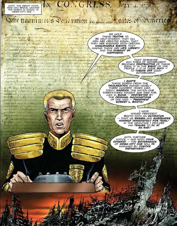 2000 AD is best known for its wild stories from the future, but with Judge Dredd: Origins, the comic publisher takes a rare look into the past... Judge Dredd's past, that is. Hitting bookstores today, March 19th, Judge Dredd: Origins takes readers all the back to January 9th, 1999 to witness the birth of Eustace Fargo, aka the Father of Justice, aka Judge Dredd's clone dad! From America's last President to the start of the Great Atom War, readers are taken on quite a turbulent journey through the history of Judge Dredd's future world. What's even better is that this entertaining blast into the past is all told within the context of a larger story, one that has Dredd seeking out the possible remains of Eustace Fargo himself.
