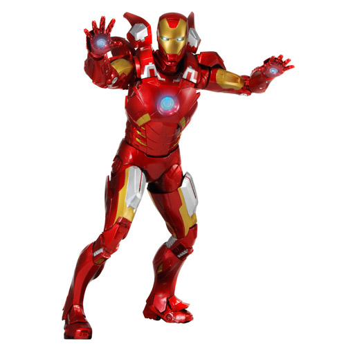 On shelves in the month of May to celebrate the release of Iron Man 3, this massive figure joins previously released Captain America (read our review HERE). Priced at around $94.99, the approximately 18 1/4" tall Iron Man is sculpted wearing his Mark VII armor and his head, chest and palms all individually light up. Includes two pairs of hands and the four aero-flaps on his back are articulated too.