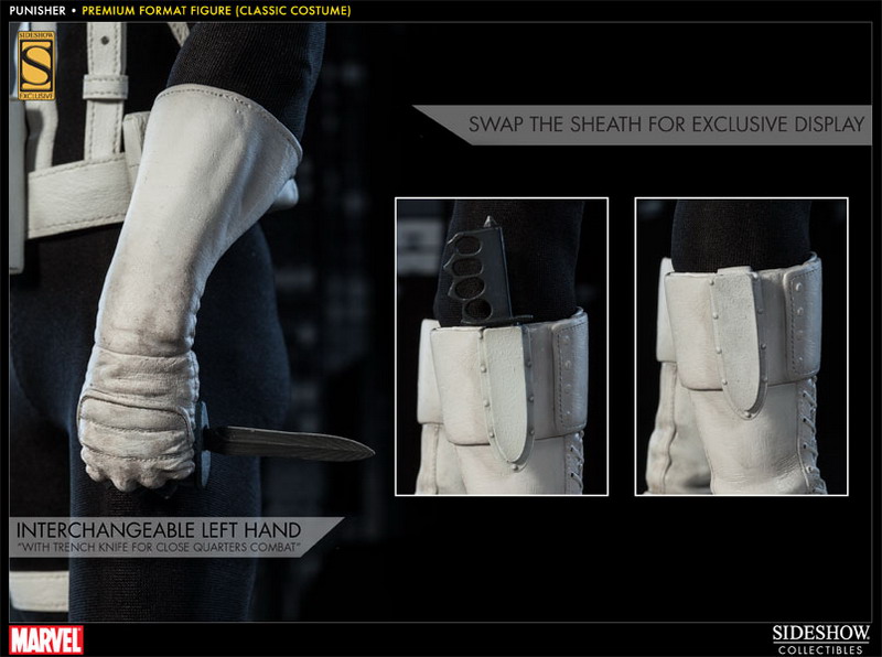 The Exclusive Punisher Premium Format Figure – Classic Costume will include a swap-out sheath and interchangeable left hand gripping the trench knife for close quarters combat.