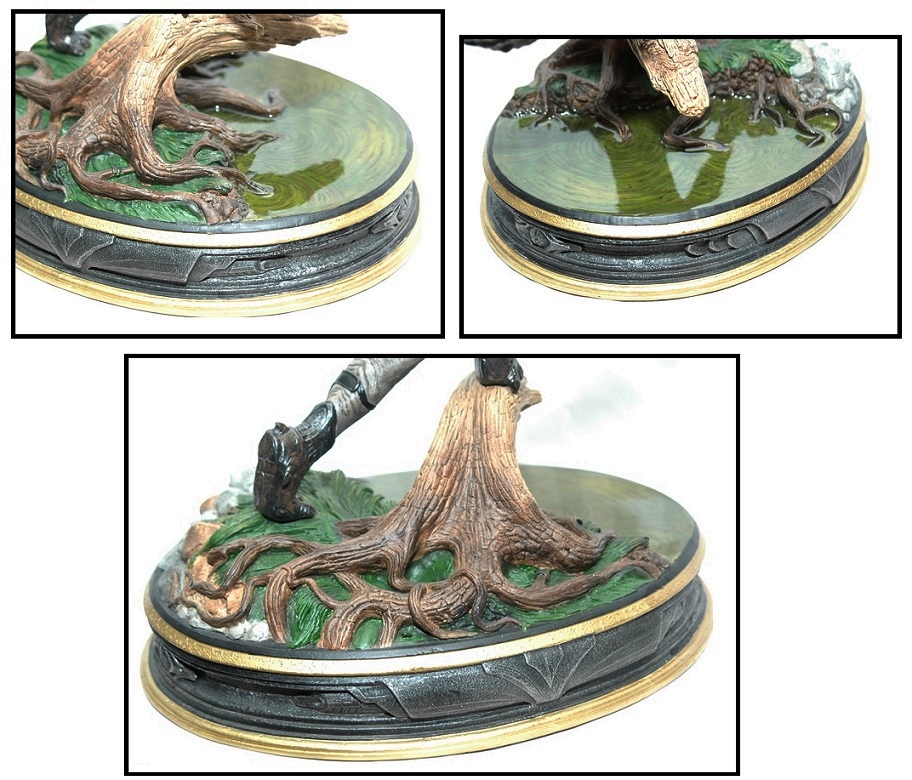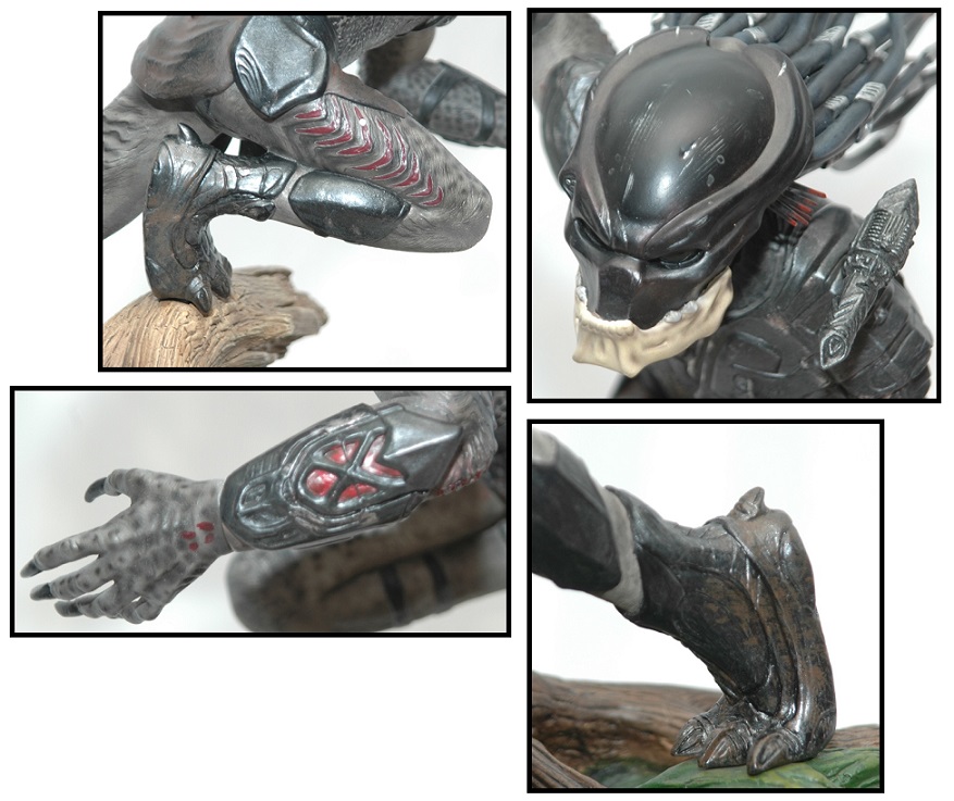 Sculpted in accurate 1/6th scale (with the Predator approximately 14.5" tall), the base of the statue is approximately 12" around and is likewise impressively sculpted with a fallen tree, foliage and a variety of rocks (below). The small boulders and rocks as well as the foliage provide an interesting setting for the statue's base while and the fallen tree plays an integral part of the statue's pose. Most impressive, the clear shiny portion of the base provides an awesome water-effect. In fact, the base is one of the coolest parts of this piece and really helps set the scene.