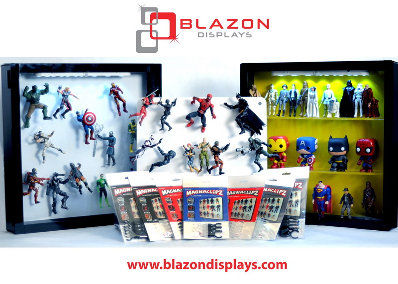 Get your figures out of the box and get organized this Summer with the help of Blazon Displays and their action figure display products! Blazon Displays provides toy collectors with two great ways to proudly showcase their treasured collections. The first is a lightweight, wall-mounted display case that has adjustable shelving and can be customized with different backgrounds. The second are Magnaclipz™ (featured on figures.com) that clip to the back of figures on one end and have a magnet on the other so figures can be displayed on any metal surface in cool action poses!