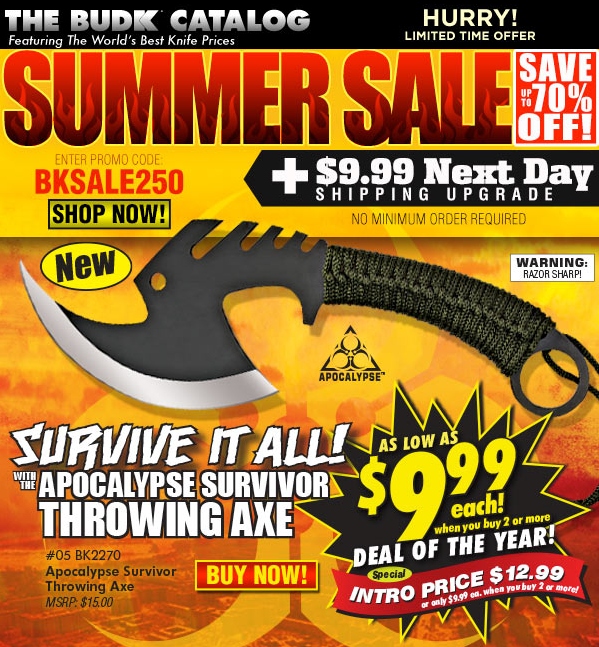 Summer time is here and BudK.com has to make room for new products. The only way BudK knows how is to slash prices like they've never done before. For one day only, BudK are offering discounts up to 70% off plus $9.99 next day shipping upgrade. Swords, knives, axes and much more! Just use promo code "BKSALE250" at checkout to receive these never before seen discounts. But don't wait, this exclusive offer ends today!