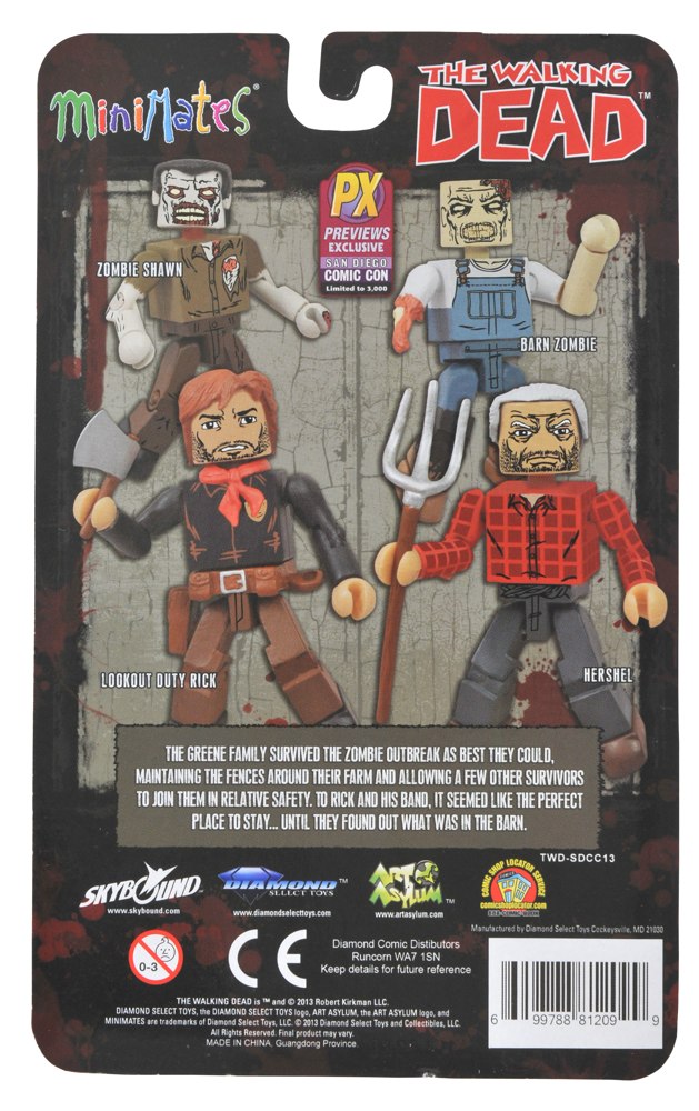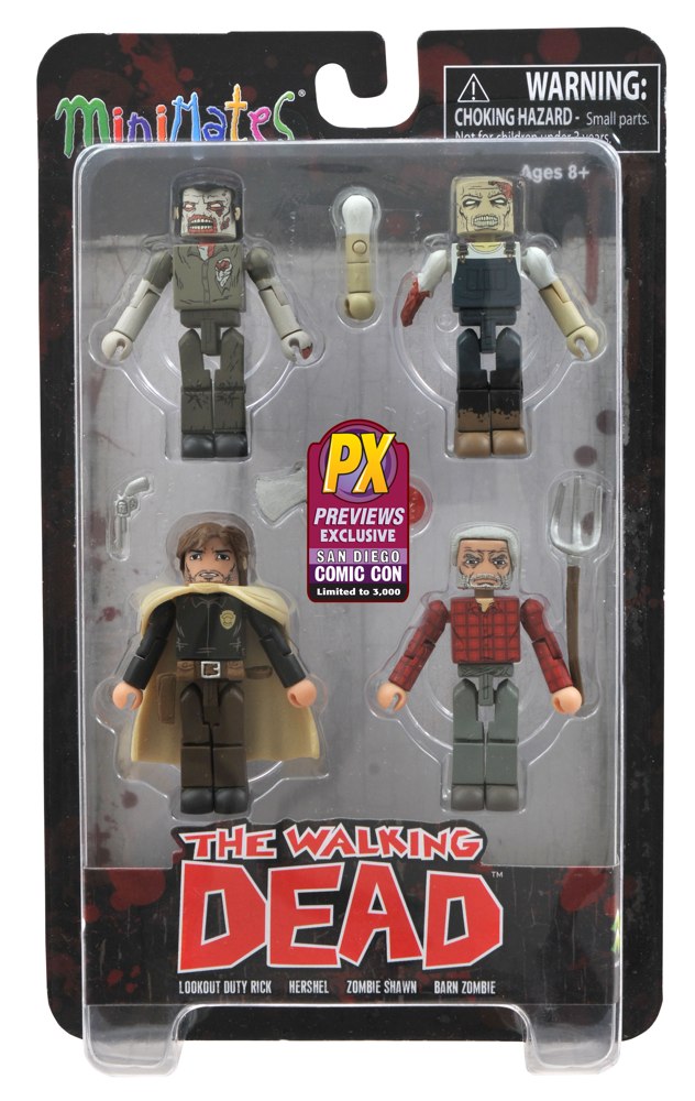 This year’s Comic-Con exclusive Walking Dead Minimates box set is titled Hershel’s Farm, and it includes four different Minimates based on the famous farmhouse story arc. Included in the set are Hershel, his deceased son Zombie Shawn, Lookout Duty Rick and a Barn Zombie. The Minimates come in a blister-carded four-pack, and each stands 2 inches tall, with a variety of interchangeable parts and accessories, including a pitchfork and a blanket. The set will be limited to only 3000 produced.