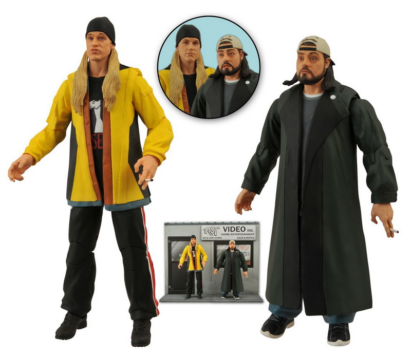 It's been 20 years since we met Jay & Silent Bob in Clerks, and DST is celebrating the less-than-dynamic duo's anniversary with their most realistic action figures ever! Based on their appearances in Jay & Silent Bob Strikes Back, these 7-inch scale figures include multiple interchangeable parts, multiple points of articulation, and connecting display bases depicting the interior and exterior of RST Video. Packaged in Select-style display packaging, with spine artwork. Sculpted by Patrick Piggott.