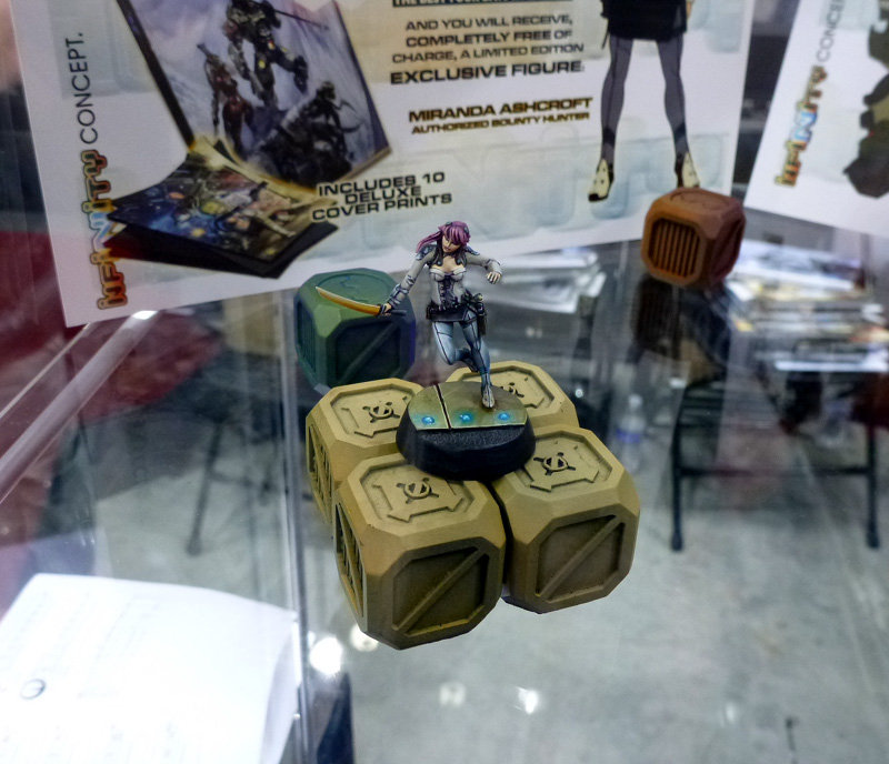 Corvus Belli celebrated Infinity's Anaconda Squadron at Gen Con this year with the pre-release of Anaconda Mercenary T.A.G. Squadron and the free (with purchase of Infinity Artbook One) Miranda Ashcroft Authorized Bounty Hunter! Meanwhile, for the uninitiated there were painted miniatures on display as well as a fully-realized battlefield complete with incredible decorations, billboards, and all sort of small details.