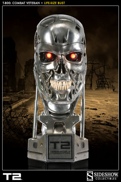 Sideshow is now accepting pre-orders on a new life-size Terminator bust: T-800: Combat Veteran. As seen in Terminator 2: Judgment Day, this film-accurate Endoskeleton skull features a weathered metallic finish, electronic light-up eyes and a removable CPU microchip.