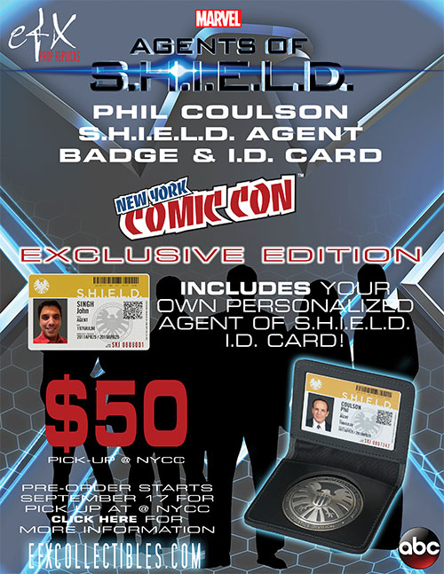eFX announces their New York Comic Con Exclusive. With the debut of Agents of S.H.I.E.L.D. premiering in just a couple weeks, eFX are offering a NYCC Exclusive Edition of a replica of Phil Coulson's S.H.I.E.L.D. Agent Badge and ID Card. The exclusive edition includes your own, personalized S.H.I.E.L.D. ID card with your picture, name and birth date. eFX will be offering a limited number for pre-order starting Sept. 17 to attendees of NYCC at efxcollectibles.com. This unique item will be priced at $50.