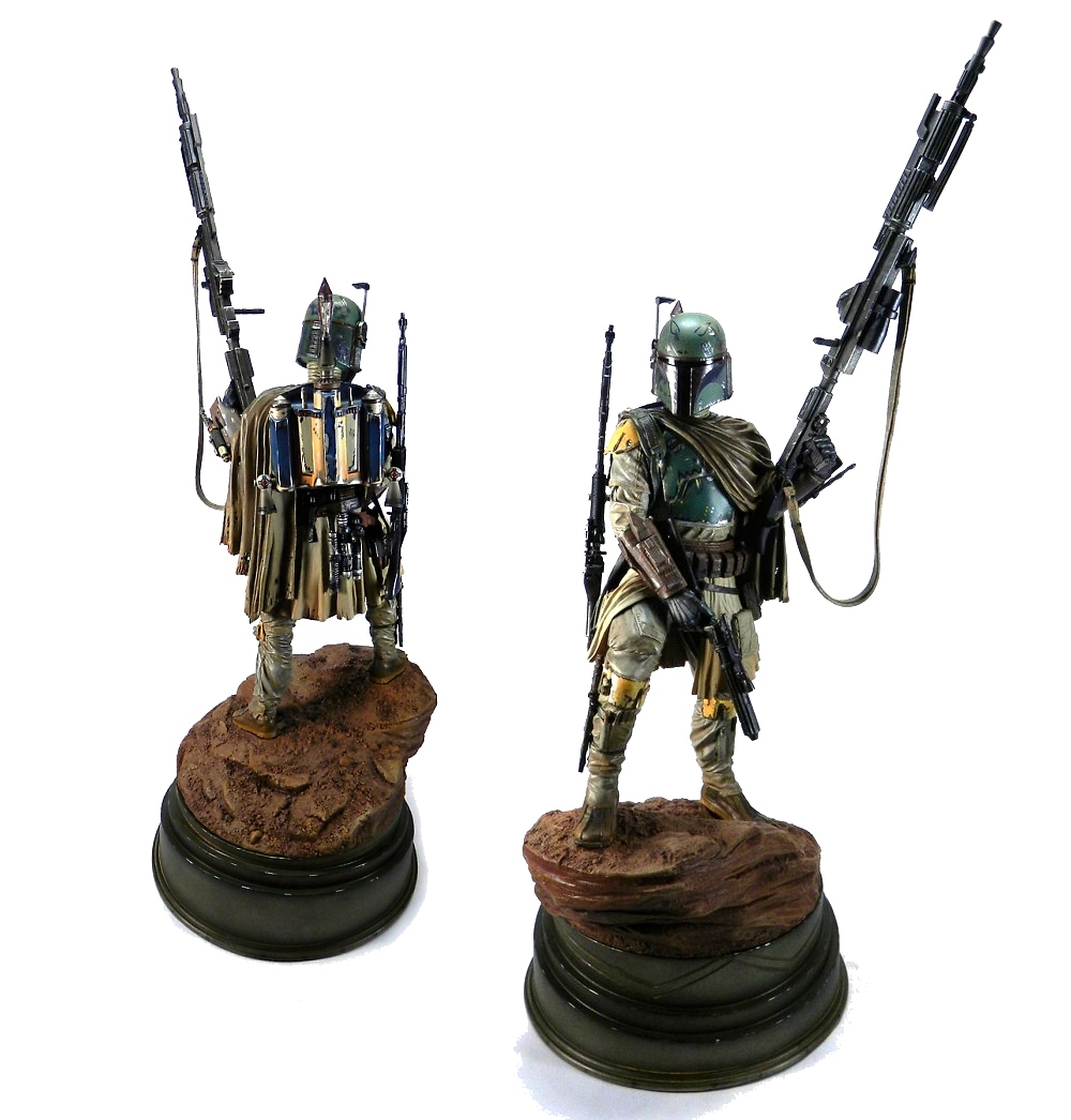 We'll have a full review for you soon, but we wanted to share over 130 new photos of Sideshow's newest Star Wars Mythos statue: Boba Fett. Sideshow's design team really went fanboy crazy with this one, taking everyone's favorite bounty hunter and making him even cooler. This dynamic piece features tons of neat new additions, including a kama half-kilt, boot knife, belted collection of lightsabers (!), and loads of firepower, including his trademark EE-3 carbine rifle, holstered Sacros K-11 blaster pistol, shoulder slung heavy blaster and two interchangable left hand weapons: a small but powerful concussion grenade launcher or an incredibly large sniper rifle that brings the height of this statue to 26 inches tall!
