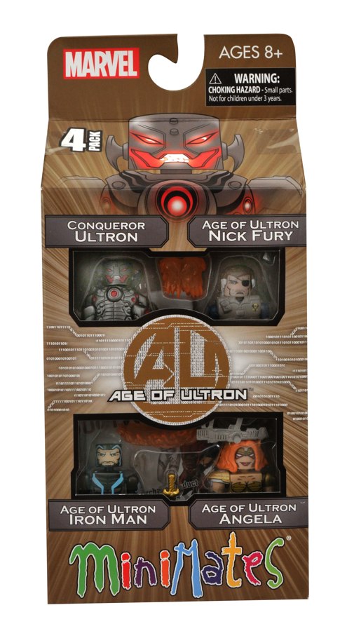 Tomorrow (12-4), the newest set of Marvel Minimates hits comic shops and specialty stores, and it’s come all the way form the Age of Ultron. Depicting the tyrannical robot Ultron as he appeared on the covers of the Age of Ultron maxi-series, this set of 2-inch Mini-figures also comes packaged with A.O.U. versions of Iron Man and Nick Fury, as well as the first-ever Minimate of Neil Gaiman’s supernatural comic character Angela. Angela comes with a sword, Iron Man has a removable helmet ad boot jets, Nick Fury has a rifle and jet pack, and Ultron sports six fully poseable arms.