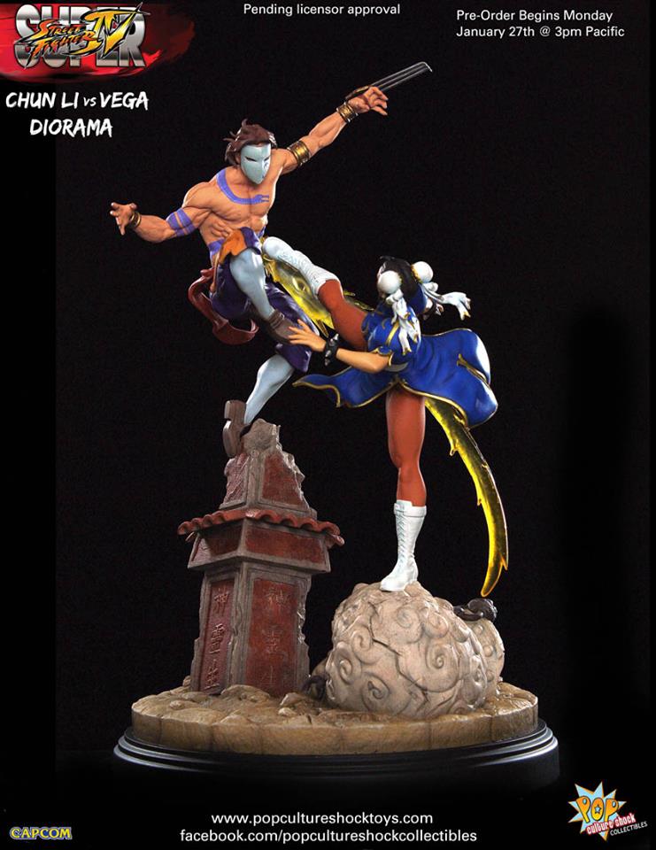 Pop Culture Shock presents their latest Street Fighter collectible, a 15" tall CHUN LI vs VEGA DIORAMA. Like all PCS releases, two versions will be offered: a standard edition (pictured above) priced at $345 and limited to 450 pieces, and a PCS Exclusive (below) priced at $379 and limited to only 200 pieces. The latter includes both Classic Chun Li and Alpha Chun Li which are interchangeable on the base.