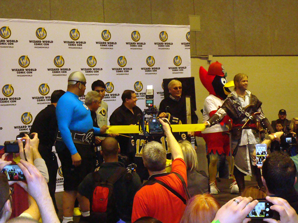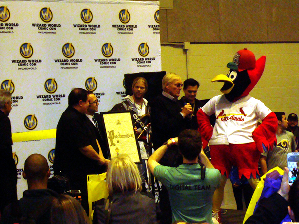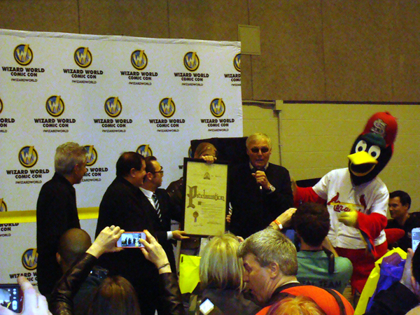 A highlight of the programming for Friday, the opening day, was a presentation on the main stage featuring Adam West and Burt Ward. To celebrate the 75th Anniversary of Batman and to open the show, the St.Louis Mayor Francis Slay presented the dynamic duo a certificate naming April 4th Batman and Robin day. Along with cutting a ceremonial ribbon, the two were presented with personalized Rams jerseys while being heckled by St. Louis Cardinals mascot Fredbird.