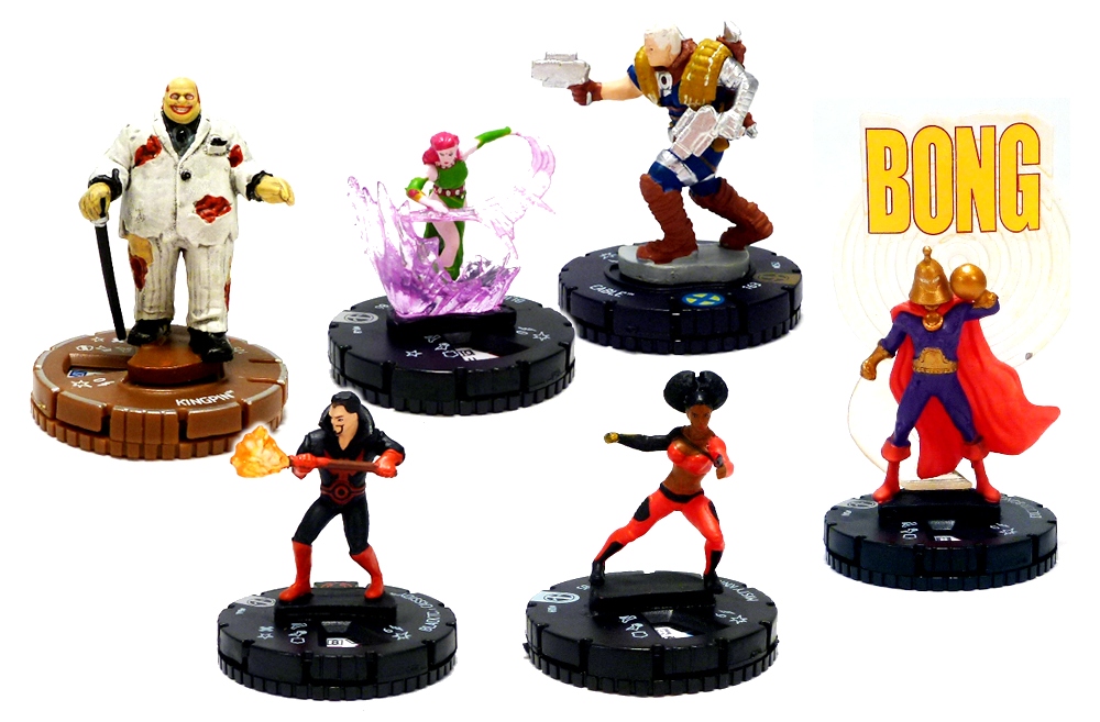 Super Rares add not one but two more Deadpools with a duo of Deadpool and Bob and the Asgardian-enhanced Deadpool (also known to fans as “Thorpool” but keeping the regular name for game effects). Three figures bring us four heroic mutants with the X-Force duo of Wolverine and X-23 and long awaited new versions of Banshee and Cable. Bad guys round out most of this bracket, though, with weird robot body Arnim Zola, awesomely 90’s T-Ray, fan favorite Kingpin, and the set’s biggest beat stick in the dual-based Tiamat. The dual natured Typhoid Mary returns to HeroClix with a unique SwitchClix function utilizing both Typhoid and Bloody Mary dials, while the Spider-Man in this set is Ock’s Superior incarnation with a ghostly Peter Parker looking over his shoulder (his base also utilizes Spider-Bots which you can find in common and uncommon slots in your boosters). The Prime pairing in the super rares features a regular Speed Demon with the rarer green-ringed Whizzer.