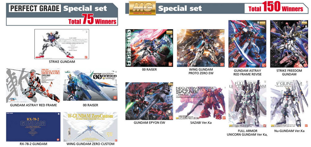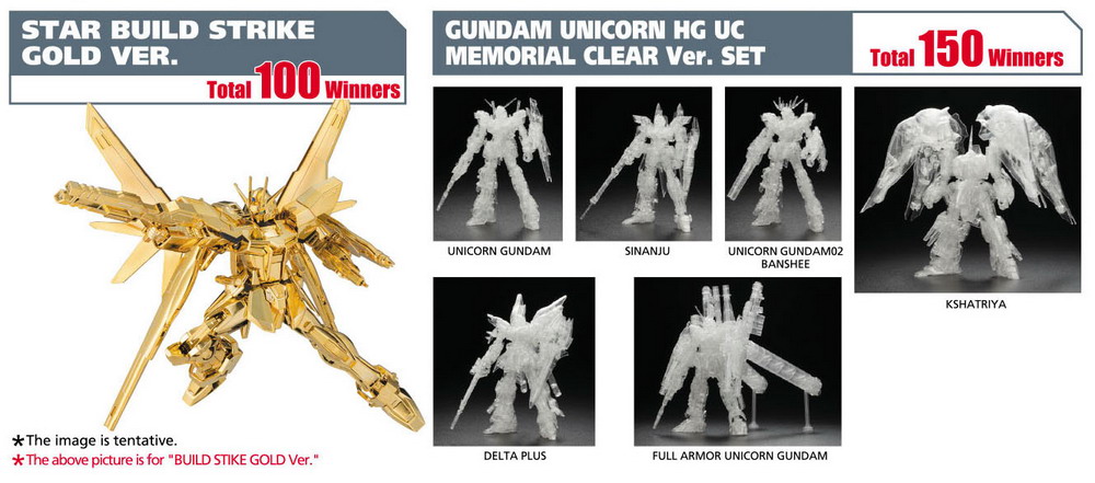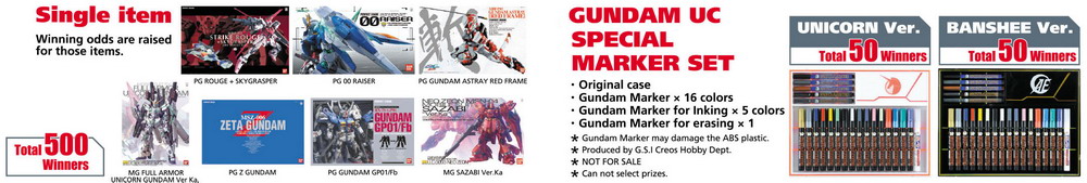 Winners will be selected by an instant lottery system from all valid entries will be notified immediately if he/she has won a prize. Winners list will be made public on "gundam.info" a week after campaign ends.