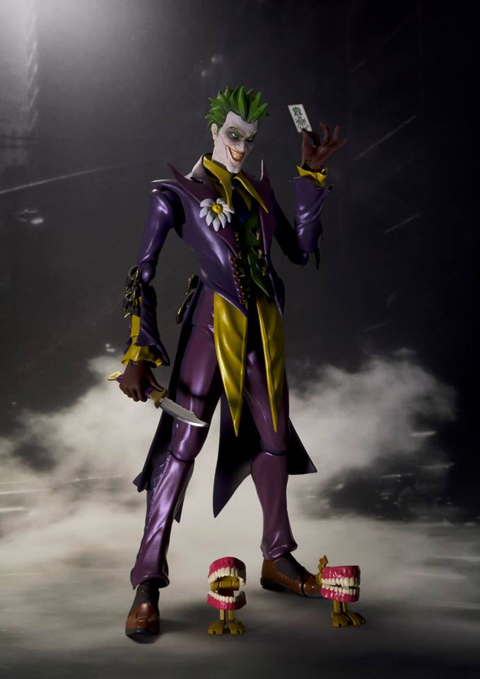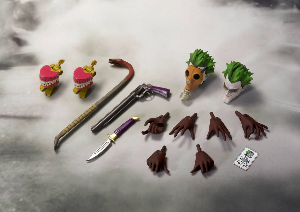 The S.H.Figuarts Joker (INJUSTICE Ver.) includes a special, original design gas mask along with an insane array of accessories: interchangeable head part, interchangeable hand parts (3 sets), knife accessory, crowbar accessory, gun accessory, chattering teeth x2, and Joker card.