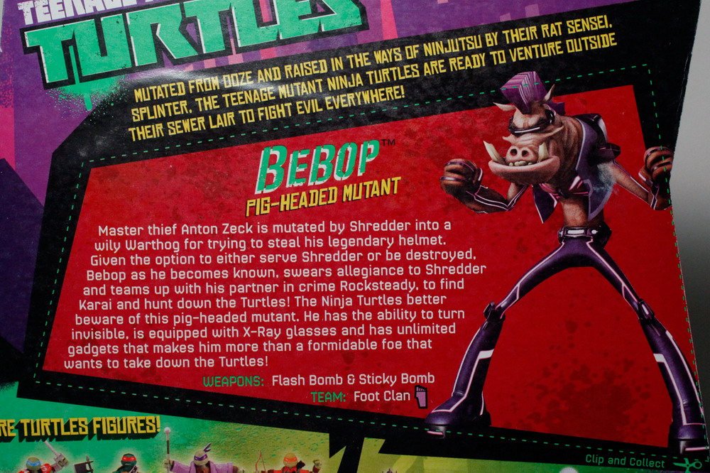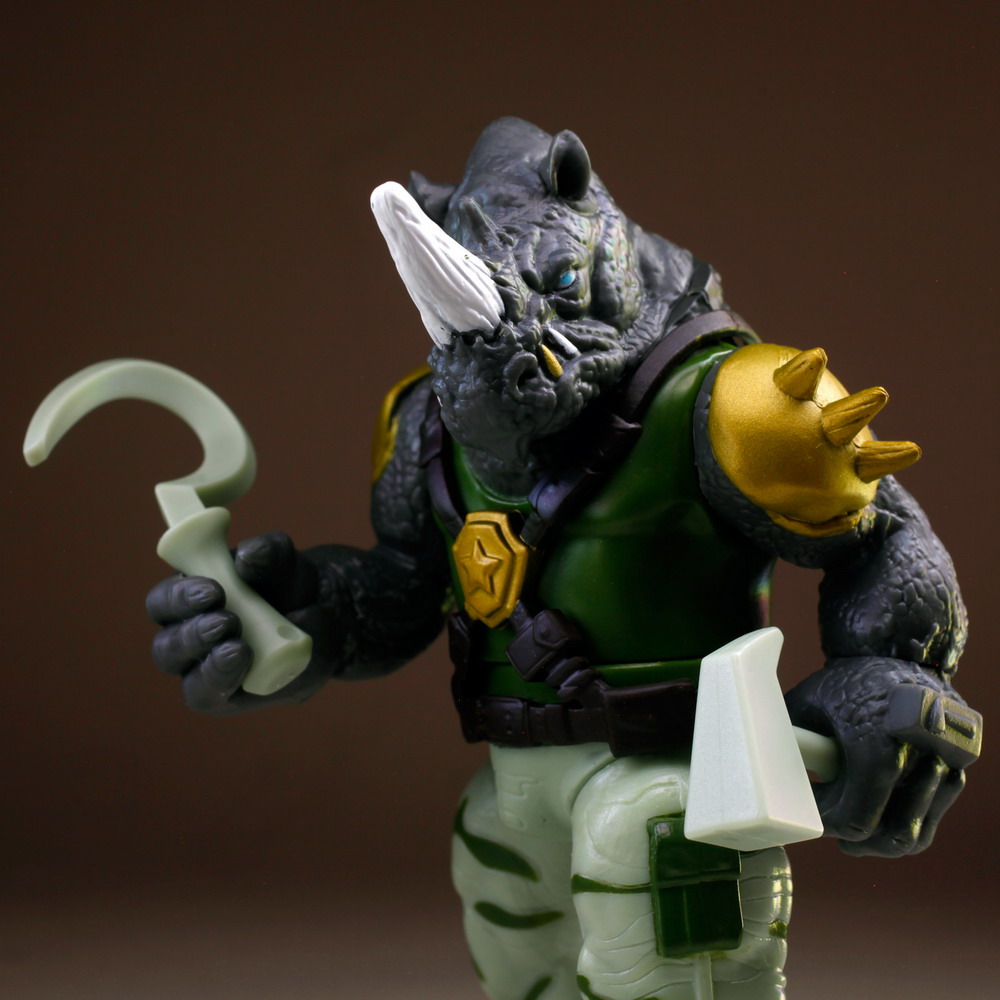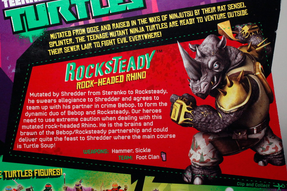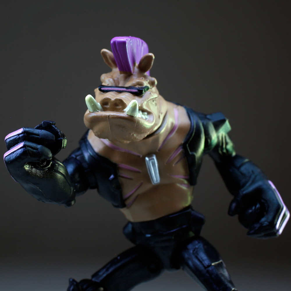 I haven’t been able to check out Bebop and Rocksteady in their cartoon appearance so there’s not all that much to compare with just yet, although there is some CG art of the characters on the packaging. These 5” figures seem a bit short compared to Shredder and even the Turtles, but the sculpting is pretty decent.