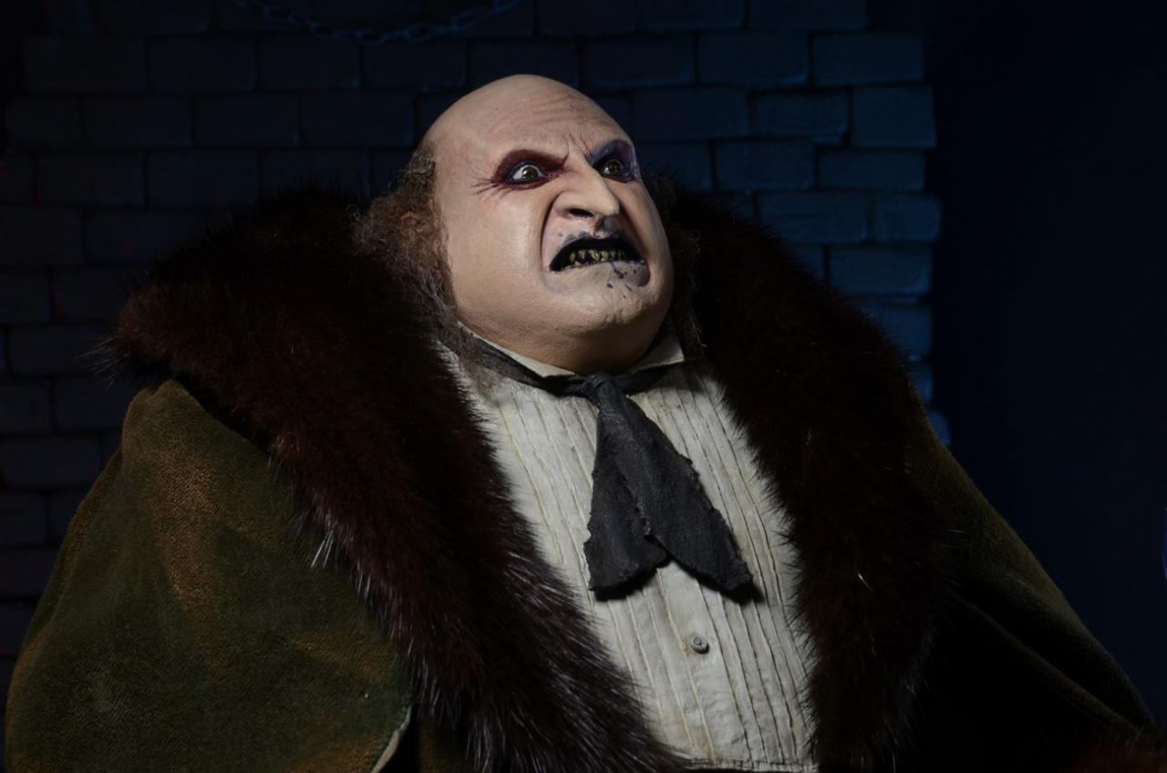 It's been shown in various prototype stages at various toy conventions last year, and now NECA finally reveals it complete. Presenting their first figure from Batman Returns, Penguin as played by Danny DeVito. The fully poseable figure stands 15″ tall and features synthetic hair and a movie-authentic sculpt. Penguin comes with a removable fabric coat trimmed with faux fur, removable top hat and umbrella accessories.