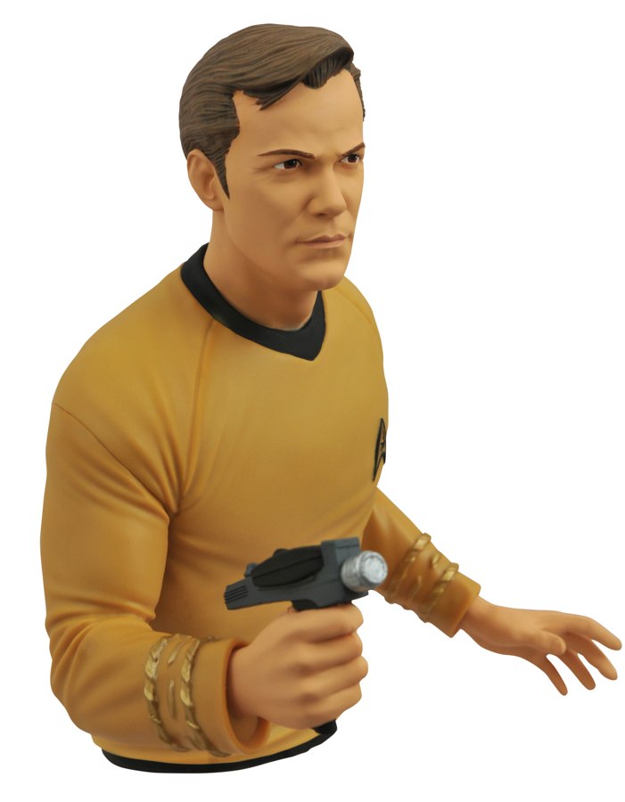 Joining first officer Mr. Spock, here’s the second bank in DST’s Star Trek line – Captain James T. Kirk! The stalwart captain of the U.S.S. Enterprise levels his phaser at anyone who would even think about stealing the money you keep inside this vinyl bust bank. With a coin slot on the back and an access door in the base, this 8″ bank features collectible-quality painting and sculpting. Make owning it your prime directive! Sculpted by Patrick Piggott! Comes packaged in a clear polybag. (Item #OCT142192, SRP: $22.99)