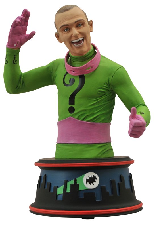 Riddle me this, riddle me thus — who will be the next Batman TV bust? The Riddler, as played by Frank Gorshin, is the fourth in DST’s line of resin busts based on the Batman Classic TV Show! Joining the Joker in the ranks of Batman’s greatest foes, this bust of an unmasked, unhinged Riddler measures approximately 6 inches tall atop a base inspired by the show’s famous opening animation. It’s the answer to what to get if you’re a Batman fan! Packaged in a full-color box. Designed by Barry Bradfield! Sculpted by Jean St. Jean! Coming this winter! (SRP: $59.99, item #AUG142280)