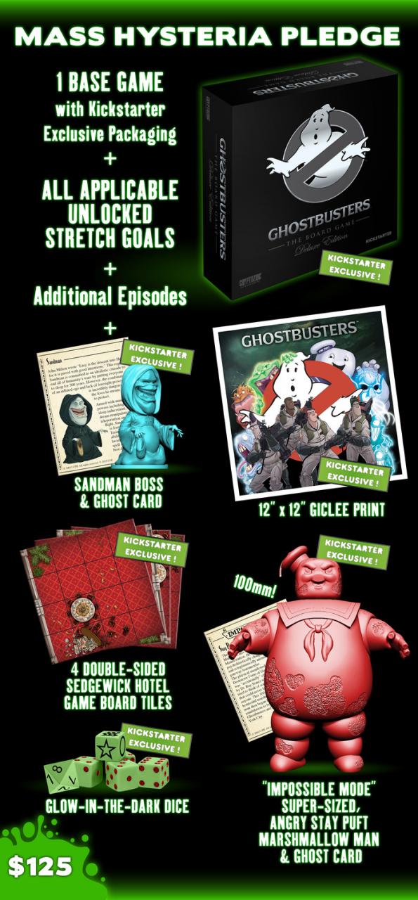 Cryptozoic will be offering a few options for backers. The base version of Ghostbusters: The Board Game is available for $80 and includes four Ghostbusters figures, 40 ghost figures, 10 double-sided game board map tiles, instructions and scenarios with art from Dan Schoening, various tokens, cards and dice. The exclusive $125 Deluxe Edition comes with everything from the base game, along with a limited edition foil-stamped box, a 12”x12” giclée print, glow-in-the-dark dice, four additional game board tiles, an exclusive boss ghost figure and an over-sized “Impossible Mode” Stay Puft Marshmallow Man figure. Additional pledge levels add exclusive ghosts, new figures and much more to expand the game further.