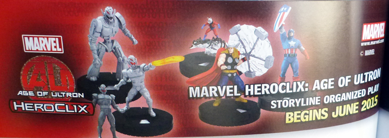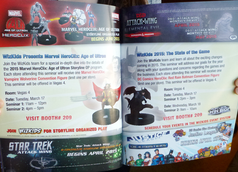 - WizKids traditionally packs seminar rooms and will be doing so again with two different presentations. The “State of the Game” talk will explain WizKids’ product lines to stores and go over the different games (HeroClix, Attack Wing, Dice Masters, etc.), and store representatives there will also get a DC HeroClix: Red Rain Batman convention figure. Meanwhile, the big news will be coming out of the “WizKids Presents Marvel HeroClix: Age of Ultron” panel going over this year’s mega Storyline Organized Play event! Stores going to that panel will get a Marvel HeroClix: Vampire Wolverine convention figure. Last but not least, the two-page WizKids spread in the GAMA program included some nice renders of upcoming Marvel HeroClix Avengers and Ultron figures!