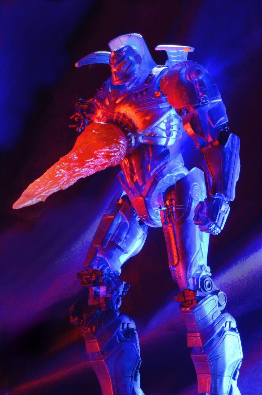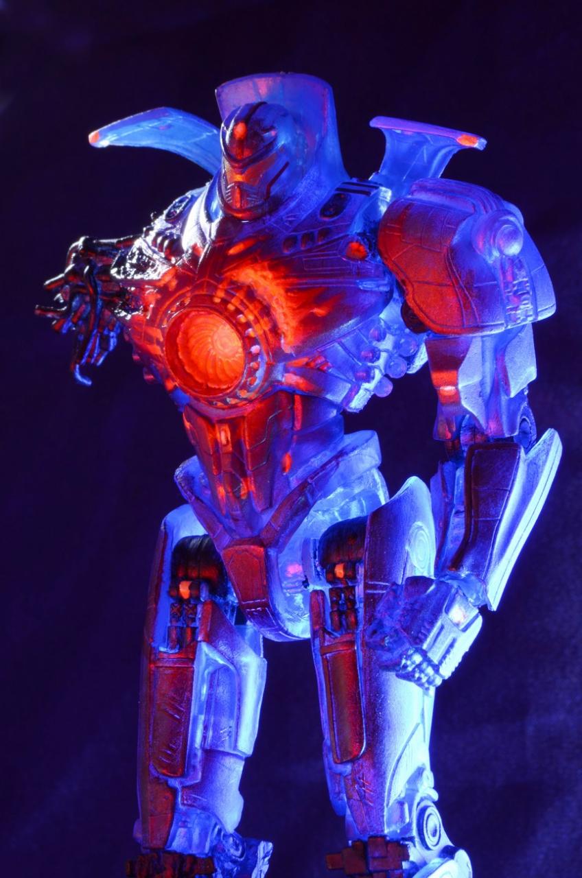 This 7” scale Gipsy Danger features a special translucent blue body with iridescent paint to mimic the Jaeger’s appearance when it crosses over to the Anteverse, the alien universe that is the source of the Kaiju attacks.