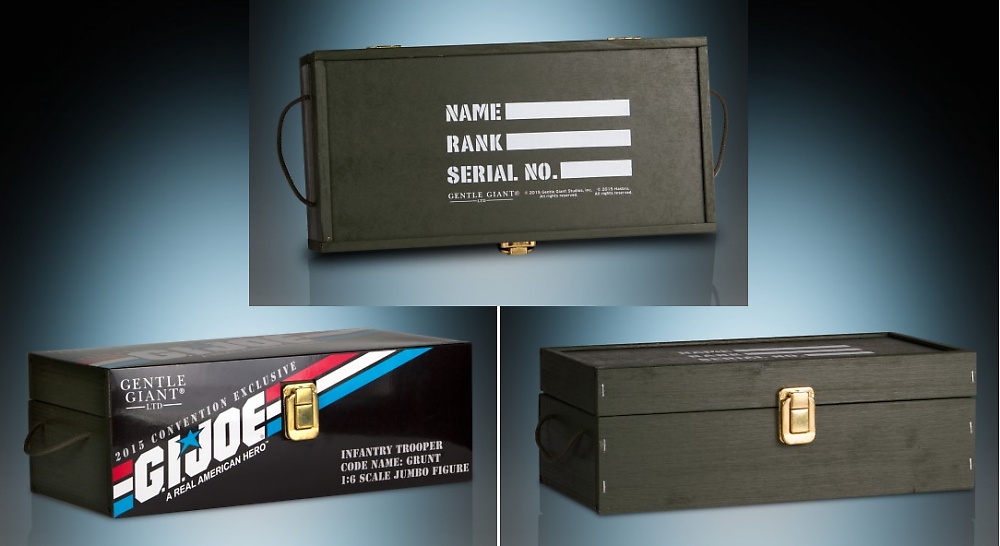 Gentle Giant reveals that they will be offering a San Diego Comic-Con Exclusive G.I. JOE Deluxe Jumbo Figure of Graves, Robert W., Code Name: GRUNT. To be available at Gentle Giant's booth #3513 priced at $130, the 12 inch figure is an exact reproduction of the vintage figure produced in the '80s. What's extra special about this San Diego Comic Con 2015 Exclusive is that it will feature a wooden "footlocker" packaging.