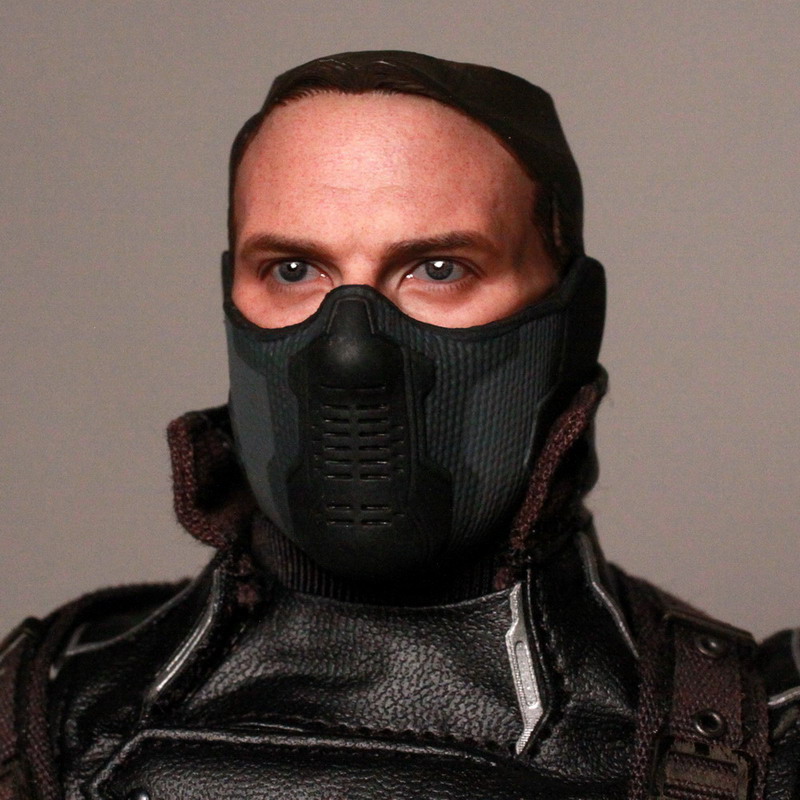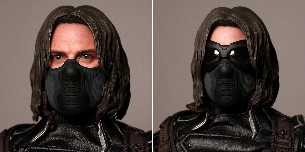 Two portraits for The Winter Soldier and three possible looks. For starters, the unmasked head is how we see Bucky later in the film. The second portrait is Winter Soldier with a mask. A separate goggles piece plugs into the side of his face but before you do that you’ll remove his hair piece to do so. Connecting via magnet, the hair sits on his head tightly enough.