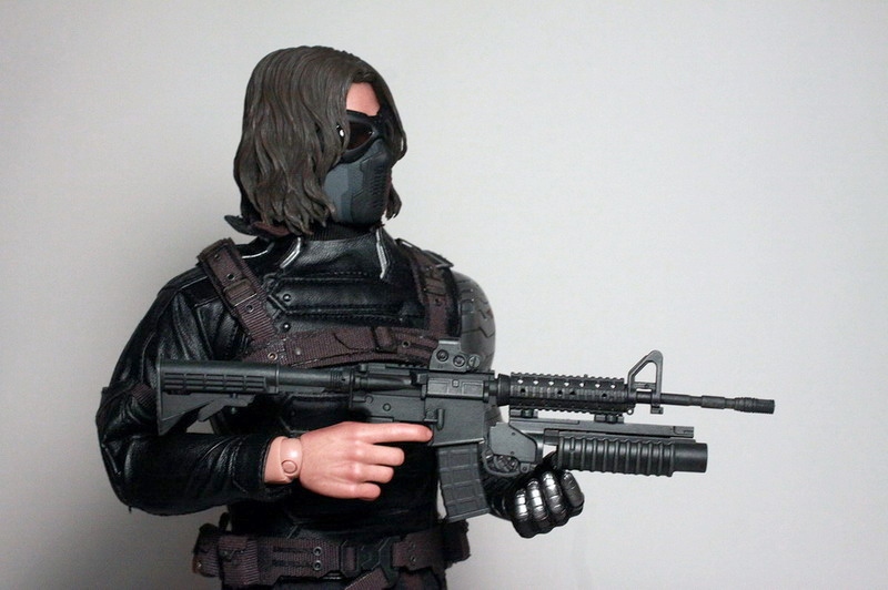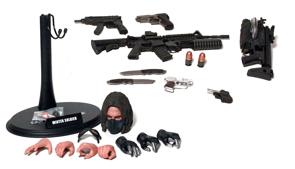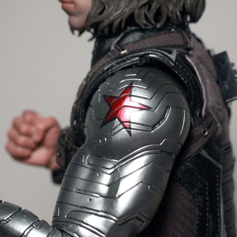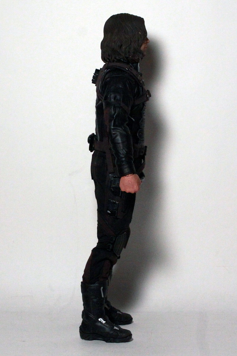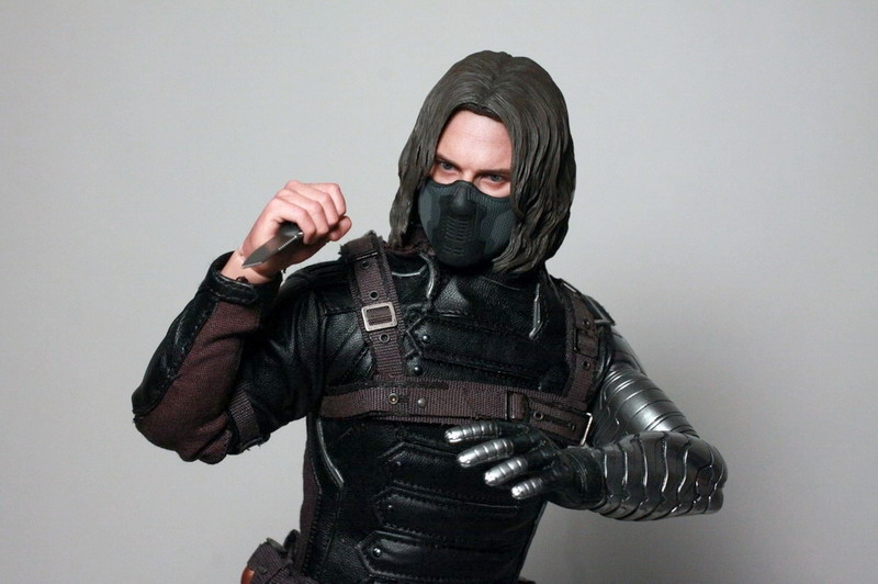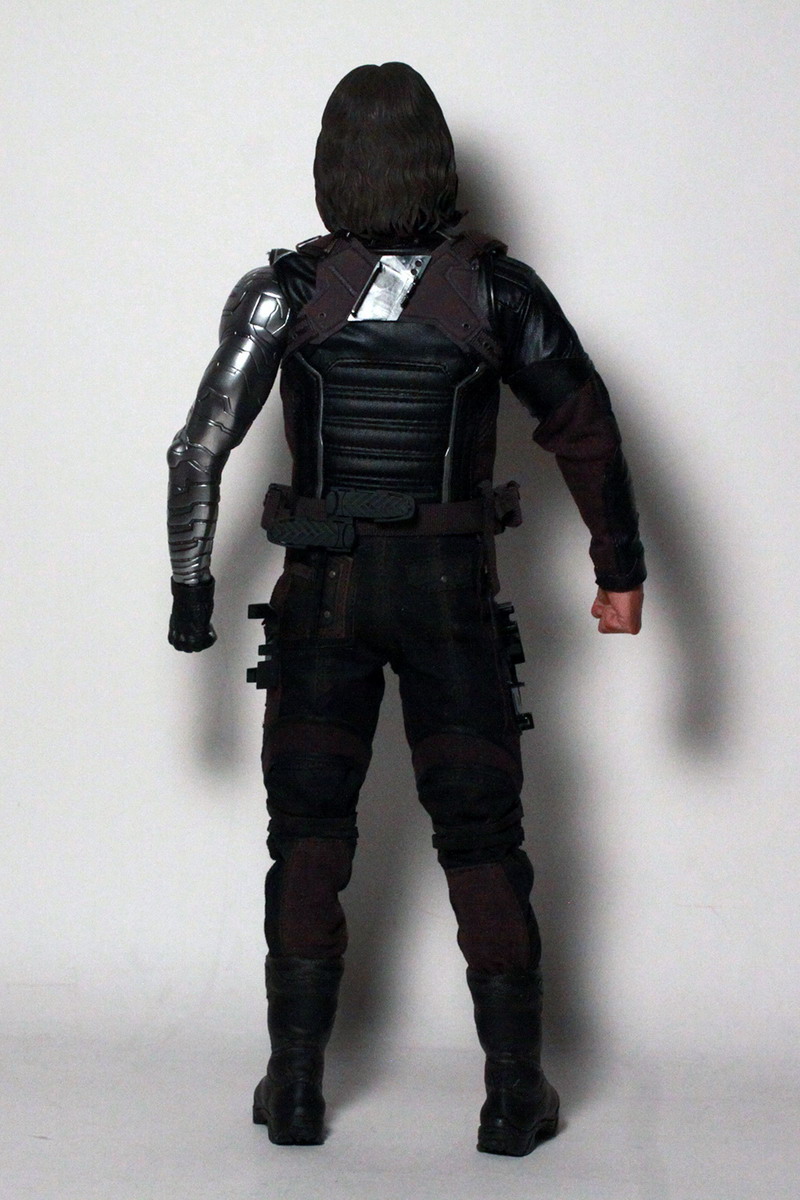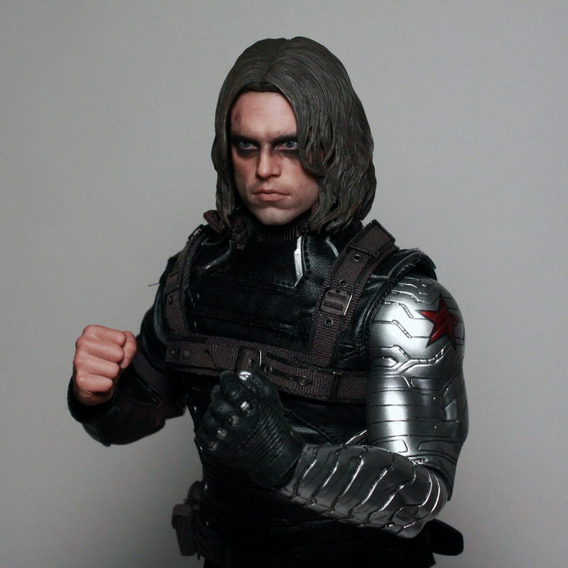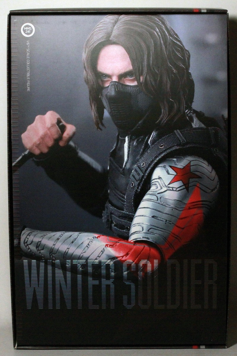 The packaging shows a production still of Sebastian Stan as The Winter Soldier, a large red Soviet star behind him and the crew of Hot Toys on the back. The box is sturdy, keeping contents safe for the most part. Inside is an insert sleeve with a photo of the Hot Toys Winter Soldier and below that, multi-layers of trays containing the figure, accessories, and display stand. There are no twist ties but there is tape and plastic wrapped around the hands and feet. Sometimes I’m lucky to pull them right off but sometimes they’re a real pain.