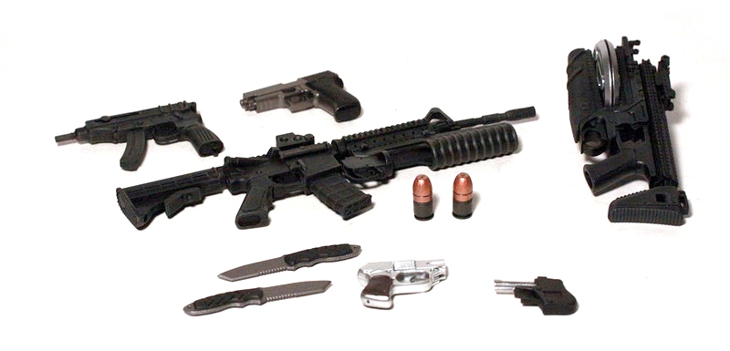In addition to the hands, he comes with a slew of weapons to use on his opponents. There is one machine gun, one remote bomb launcher, one submachine gun, three pistols, two daggers, two grenades, and one spike with sheath.