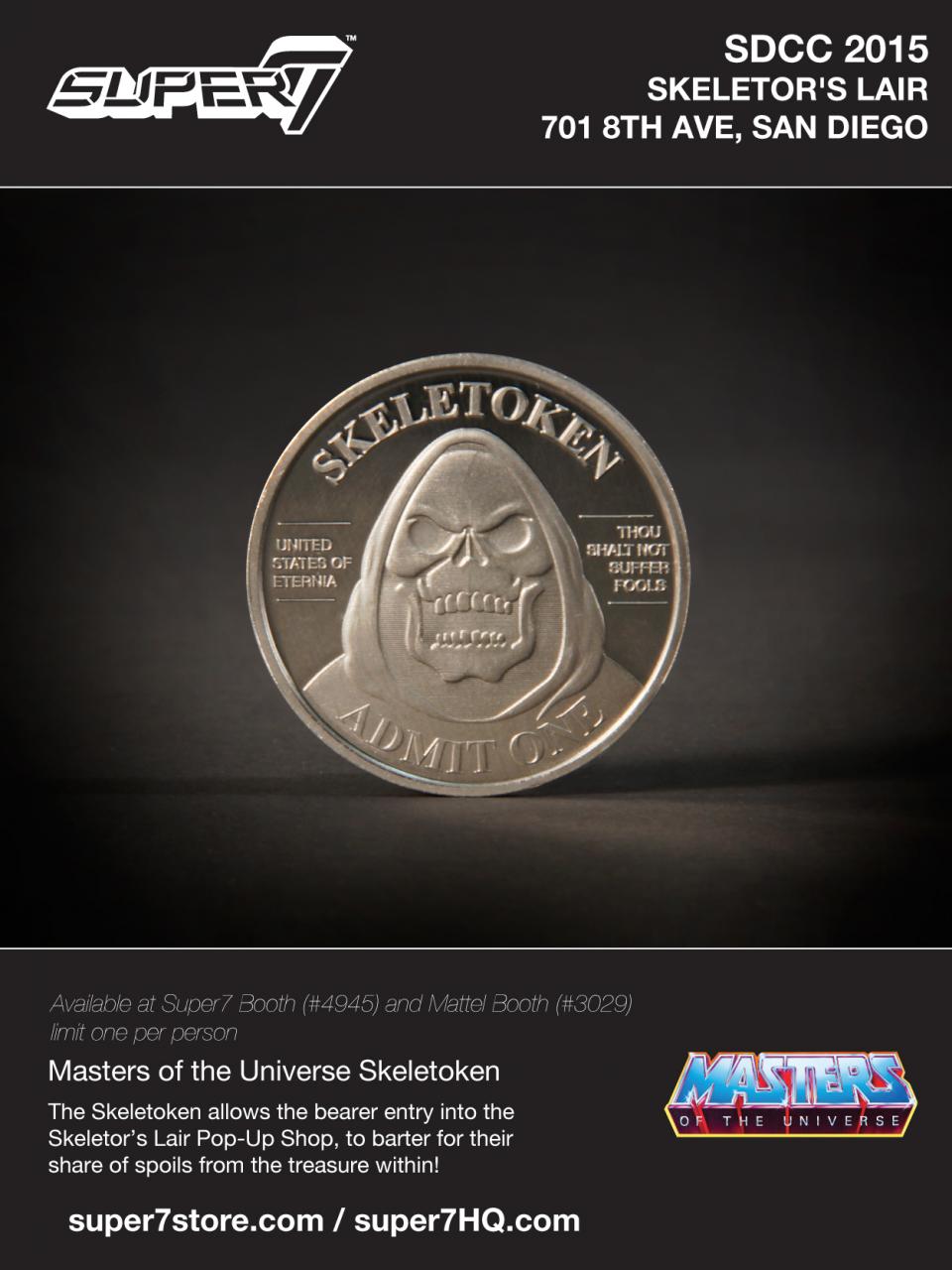 The Masters of the Universe Skeletoken will be available at both Super7's Booth #4945 AND Mattel's Booth #3029. The token allows the bearer entry into the Skeletor’s Lair Pop-Up Shop, “to barter for their share of spoils from the treasure within”. At the pop-up shop, which will be Super7’s San Diego East Village retail location (701 8th Ave), Super7 will be releasing exclusive He-Man and Masters of the Universe items. No word on whether this token will cost anything, or if it will simply be free, the booth handout allowing you entry into the shop to actually buy exclusive MOTU product. I'm thinking the latter.