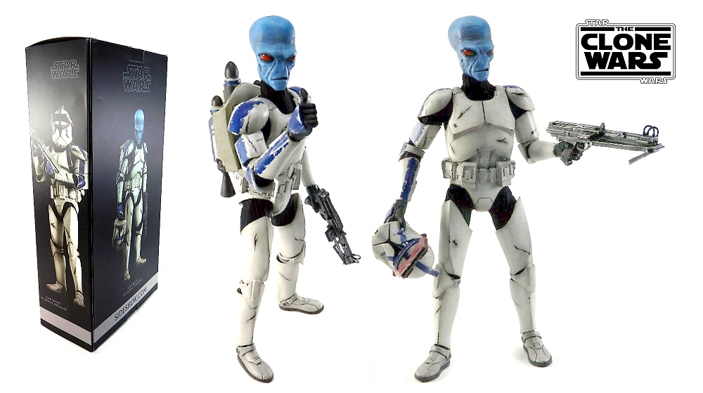 Making smart re-use of their excellent 1:6 Clone Trooper weapons and armor, Sideshow presents Cad Bane in Denal Disguise. This figure is available for pre-order now priced at $149.99 and is scheduled to ship very soon. The figure depicts Cad Bane from the Clone Wars Season Two episode "Cargo of Doom" where the bounty hunter confronts and kills Clone Trooper Denal and assumes his identity to escape the Republic's clutches. Cad Bane is clever like that and this figure represents the bounty hunter's cold and calculating personae perfectly.