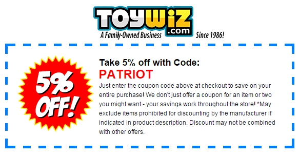 ToyWiz.com has thousands of in-stock items. Use the coupon code PATRIOT and receive 5% off your purchase! Shop from an incredible selection of the newest and most popular action figures, toys, and collectibles including:
