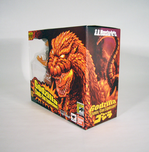 All of the MonsterArts figures come in cool window boxes, and this Godzilla is no different. To celebrate its primary color and exclusive status, the box is dominated by orange/red graphics on a dark background. The front panel features an enormous Godzilla head next to the window through which you can see the figure. Below the window is the figure’s name, and in the bottom-right corner are the requisite company logos and the Comic-Con “eye.” Godzilla peeks through one side panel while on the other the front image wraps around. The top of the box has another window, this one “breaking through” the packaging background image and repeating the figure’s name, twice.