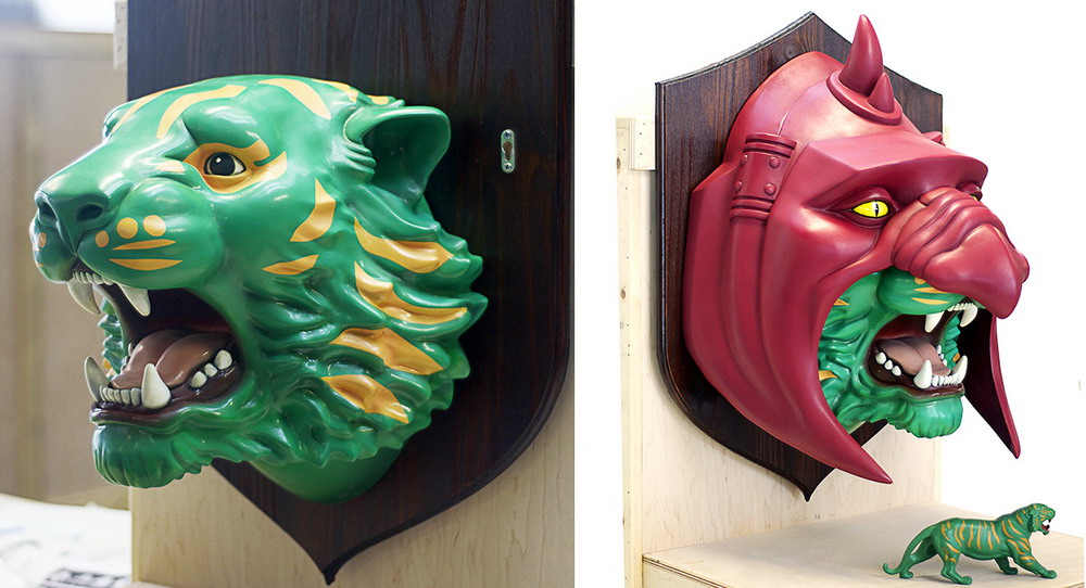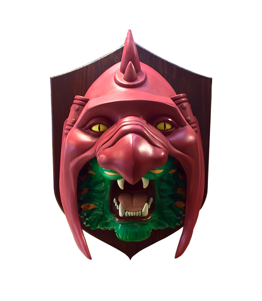 The Battle Cat Hunting Trophy is crafted by Los Angeles based art fabrication shop Pretty in Plastic from high-quality painted fiberglass, mounted on a 31″ tall, 22″ wide wooden plaque, and measures 22″ deep from the tip of the nose to the wall. Battle Cat can be displayed with our without the signature helmet, making it the ultimate centerpiece to any Masters of the Universe collection.
