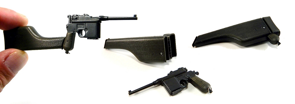 Accessories are equally impressive. The backpack features a real metal frame that holds ammo and radio boxes all via straps that are individually fastened. The large machine gun includes a working ammo receiver and bi-pod, while the pistol is a complex modular design where the "wooden" butt also plays double duty as a storage device that in turns slides into the figure's plastic gun holster.