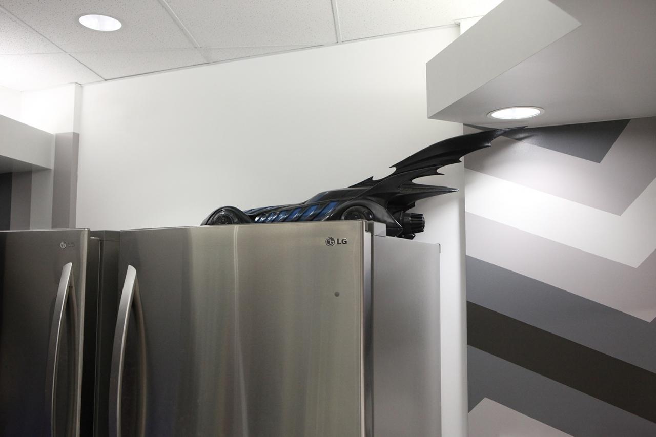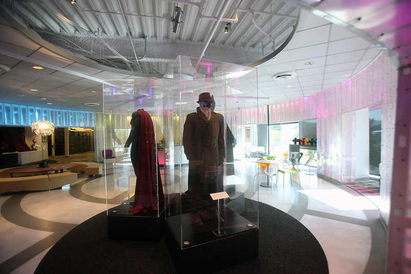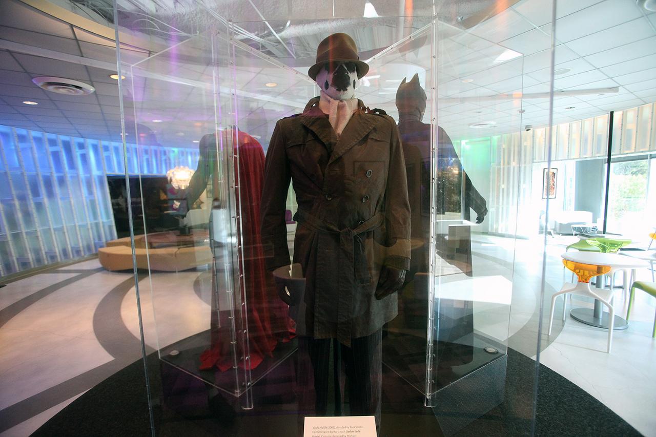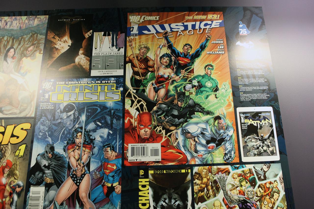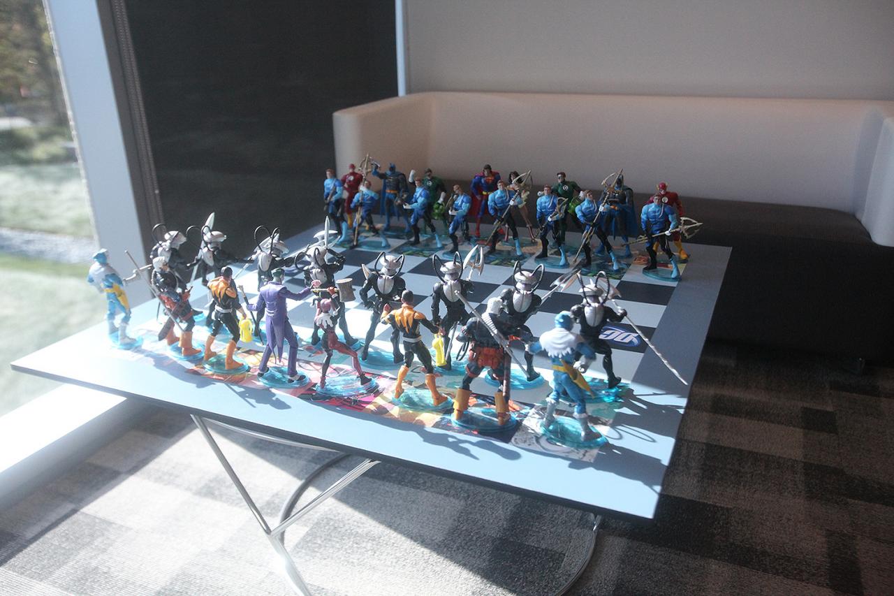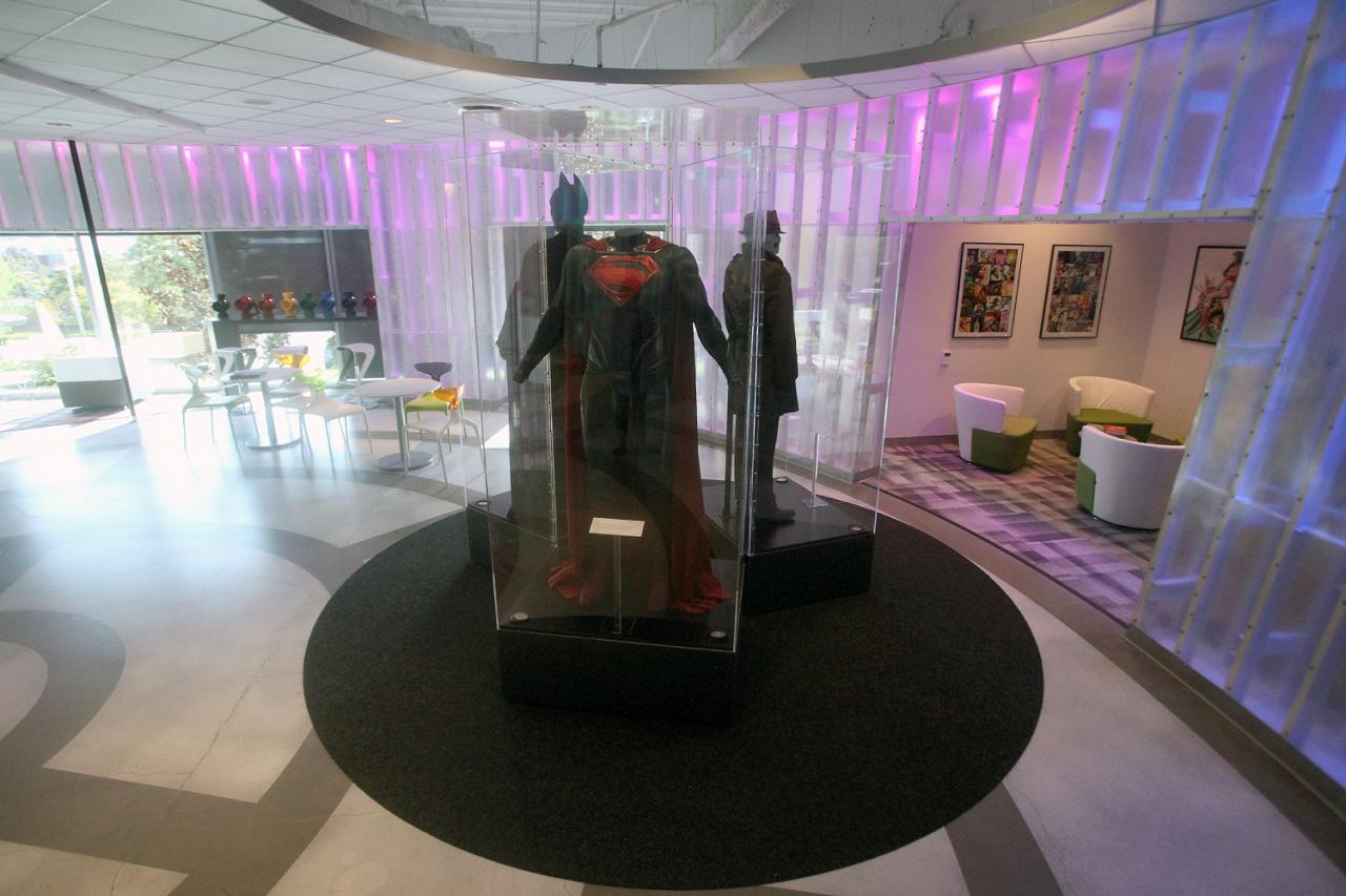 Known as the “Fortress of Solitude,” DC Entertainment’s main lobby space greets visitors with a slew of sights including video monitors showing off cool multimedia, a circular central area with glowing lights that change color, metal frames, and a vast panorama window through which you can see the famous water tower at Warner Bros. studios. Alongside the windows is a full display of Lantern Battery Prop Replicas representing the full emotional spectrum, and nearby is a comfortable alcove featuring a giant chess board populated by Mattel DC Universe Classics figures for pieces! Also on the sidelines of the lobby is a game area with both DC-themed pinball and video games as well as cool artwork and prop replicas. If you’re at the offices to wait you won’t be bored, and you can check out a trio of screen-used costumes of the Man of Steel, Batman, and Rorschach and a Lego wall “tagged” with Batman, a 3D LEGO representation of Jim Lee’s artwork from DCE’s 2012 Darkness & Light exhibit. Nearby, there is a beautiful timeline celebrating DC’s 80-year history (through this year’s Convergence event) that celebrates the company, its characters, and all the milestones achieved at the New York offices.
